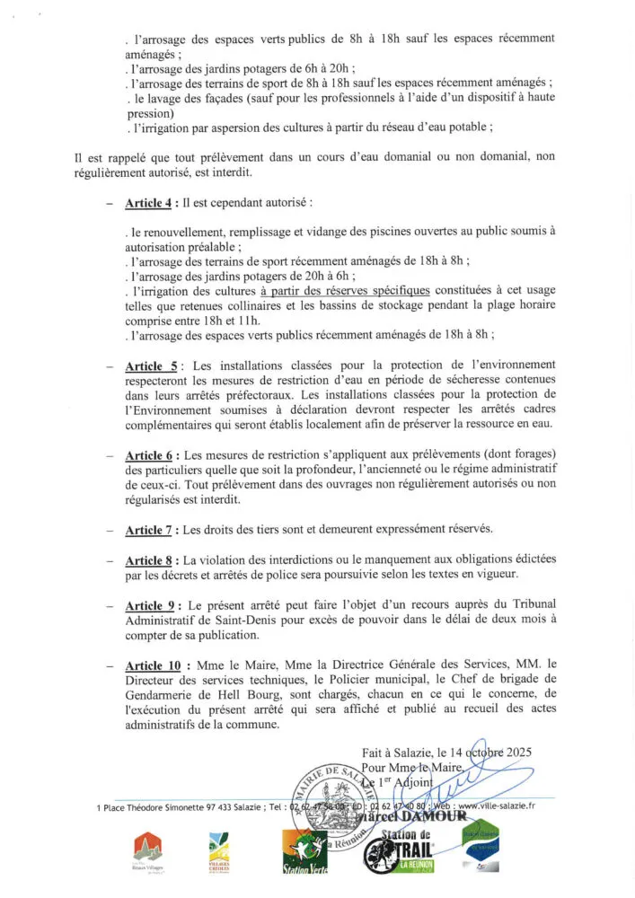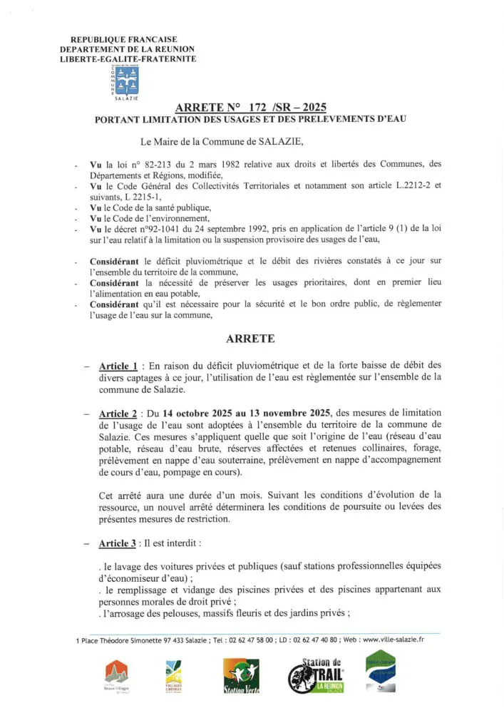 La commune de Salazie met en place des mesures de restriction de l’usage de l’eau en raison du déficit pluviométrique et de la forte baisse de débit des captages. Ces restrictions s’appliquent sur l’ensemble du territoire du 14 octobre au 13 novembre 2025 et concernent toutes les sources d’eau, qu’il s’agisse du réseau potable, des forages, des retenues collinaires ou des nappes souterraines.