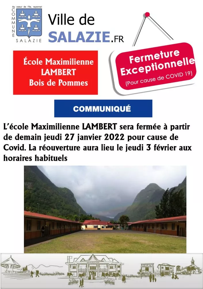 À Salazie, Bois de Pommes, fermeture exceptionnelle de l’école Maximilienne Lambert pour cause de covid, L’école Maximilienne LAMBERT sera fermée à partir de demain jeudi 27 janvier 2022 pour cause de Covid.