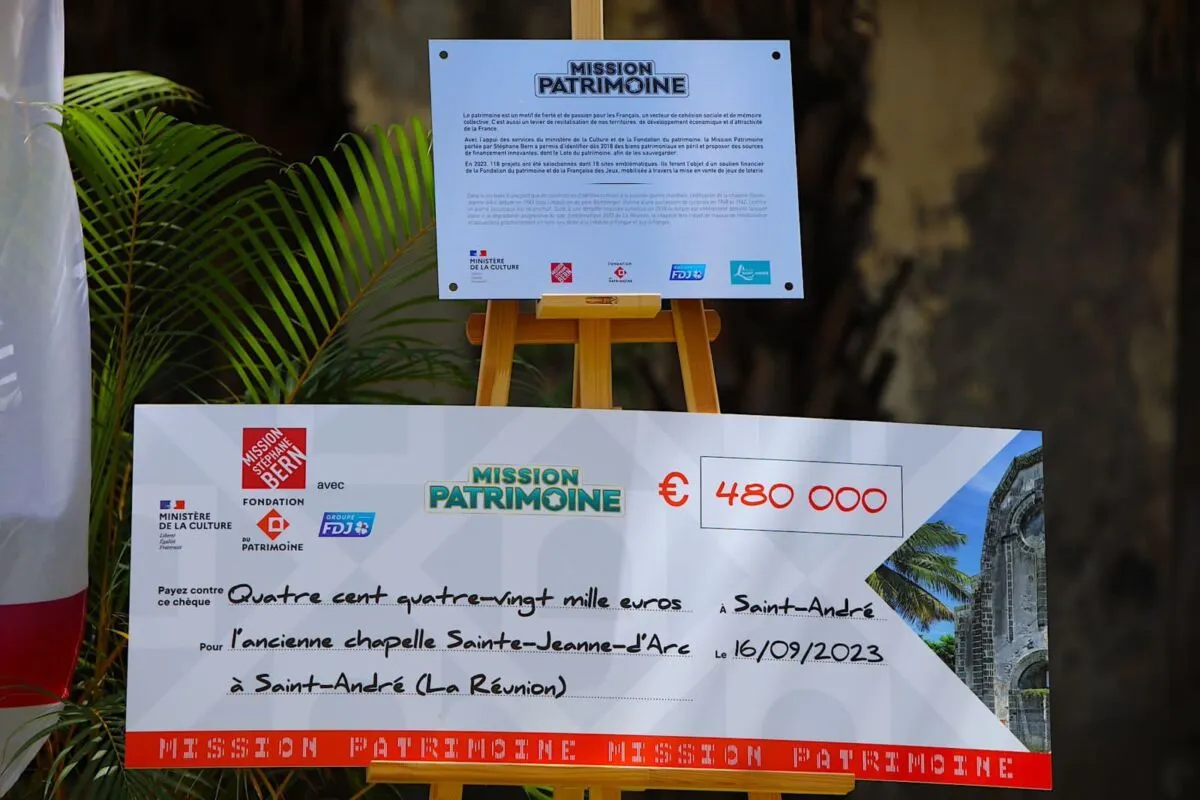 480 000 euros ! C’est le montant de l’aide financière inscrite sur le chèque de la mission du patrimoine pour la valorisation des édifices historiques et de proximité a remis pour la sauvegarde et la restauration de la salle Jeanne D’arc, à St-André.