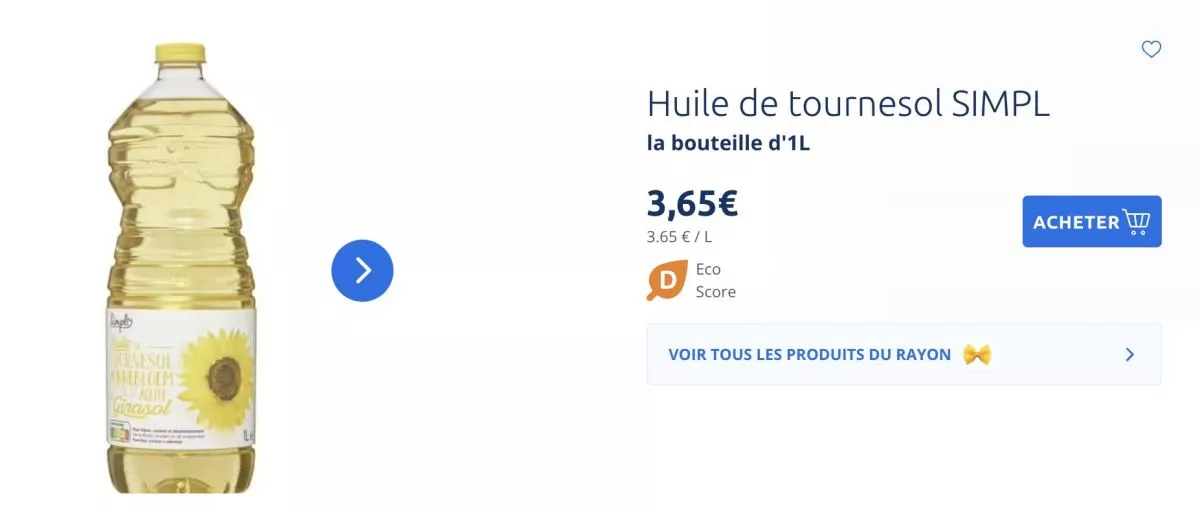 Actuellement, une bouteille d’un litre d’huile premier prix de tournesol en Métropole coute dans les grandes surfaces les plus connues aux environs de 3,65 € le litre.