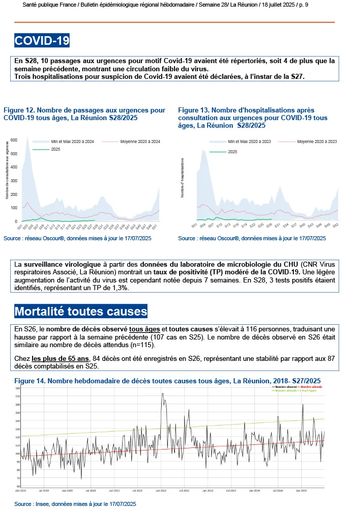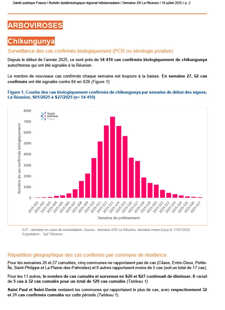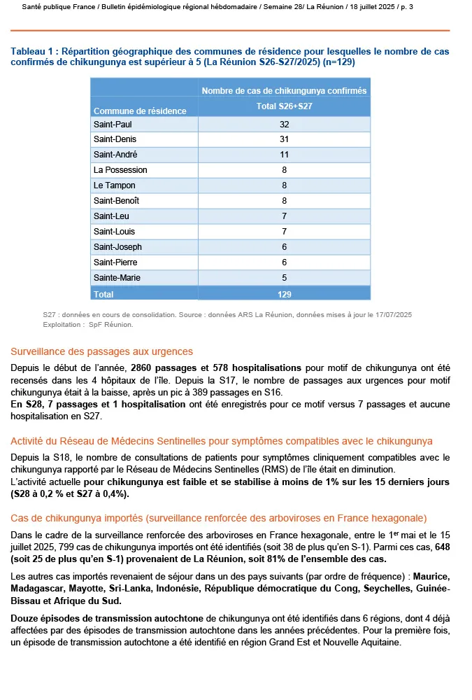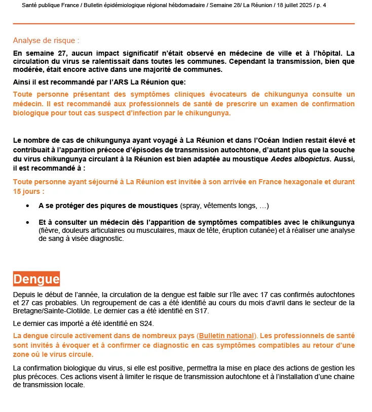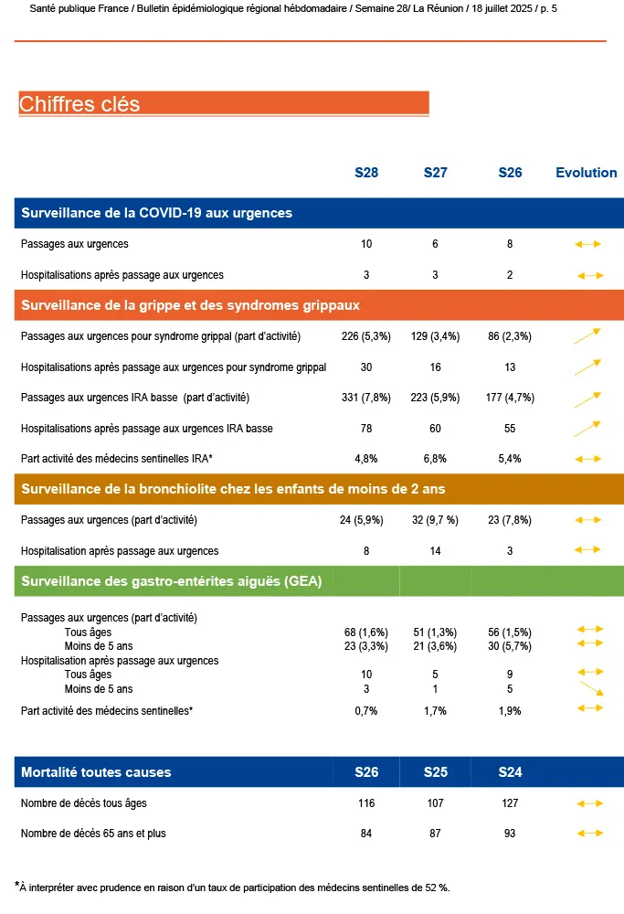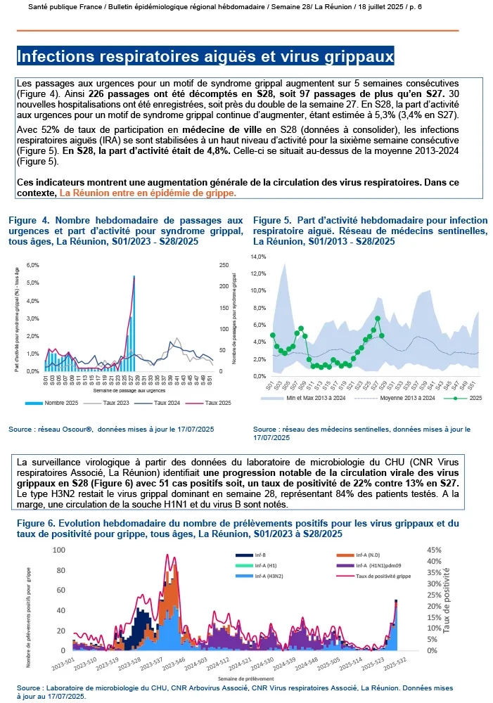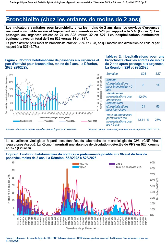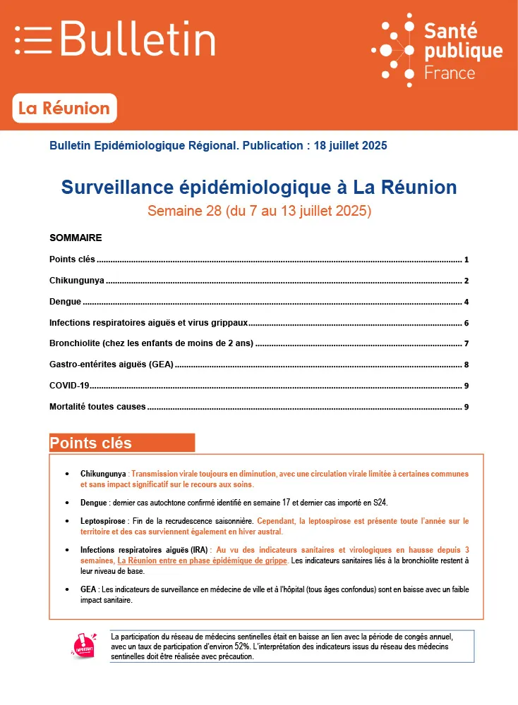 Alors que l’hiver austral se poursuit, les indicateurs sanitaires de La Réunion font apparaître une dynamique contrastée selon les pathologies. Santé publique France vient de publier son dernier Bulletin épidémiologique régional, portant sur la semaine 28 (du 7 au 13 juillet 2025), offrant un panorama détaillé de la circulation virale sur l’île.