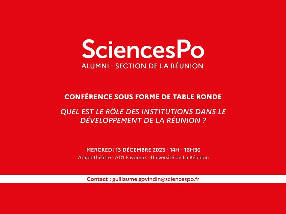 « Quel est le rôle des institutions dans le développement de la Réunion » : c’est autour de ce questionnement que s’articulera la conférence qu’organise, le mercredi 13 décembre prochain, la Section Réunion des Alumni de Sciences Po Paris, présidée par Guillaume Govindin Ramassamy, lui même diplômé de Sciences Po Paris.