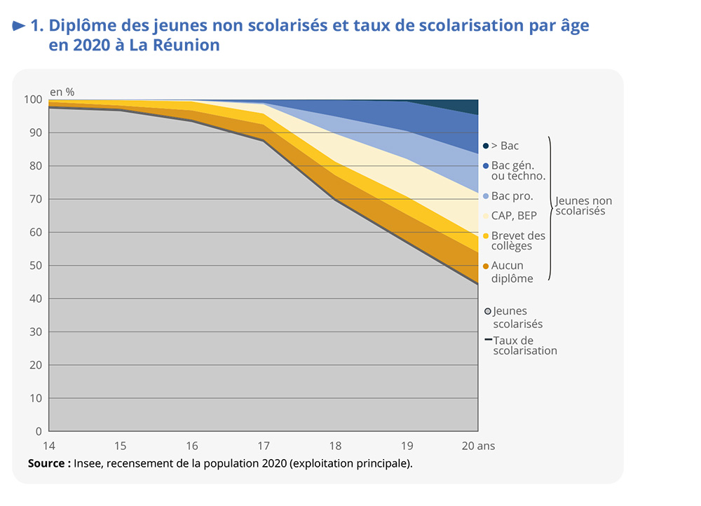 Au total, entre 14 et 20 ans, 20 % des jeunes ne sont plus inscrits dans un établissement d’enseignement à La Réunion, contre 14 % dans l’Hexagone en 2020. Ces jeunes qui ont eu une scolarité courte peuvent rencontrer de grandes difficultés pour s’insérer professionnellement et socialement, surtout pour les plus jeunes et les non diplômés.