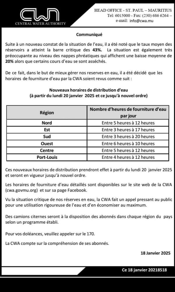 Face à une situation critique concernant les réserves d’eau à l’île Maurice, la Central Water Authority (CWA) a annoncé un ajustement des horaires de distribution d’eau à compter du lundi 20 janvier 2025. Cette décision fait suite à une baisse significative du niveau des réservoirs, désormais à 43 % de leur capacité moyenne, et à une diminution inquiétante des nappes phréatiques, estimée à 20 %, tandis que certains cours d’eau sont totalement asséchés.
