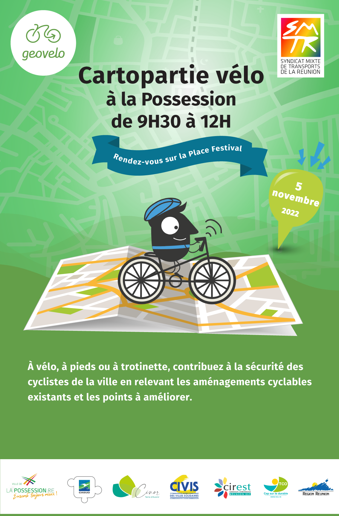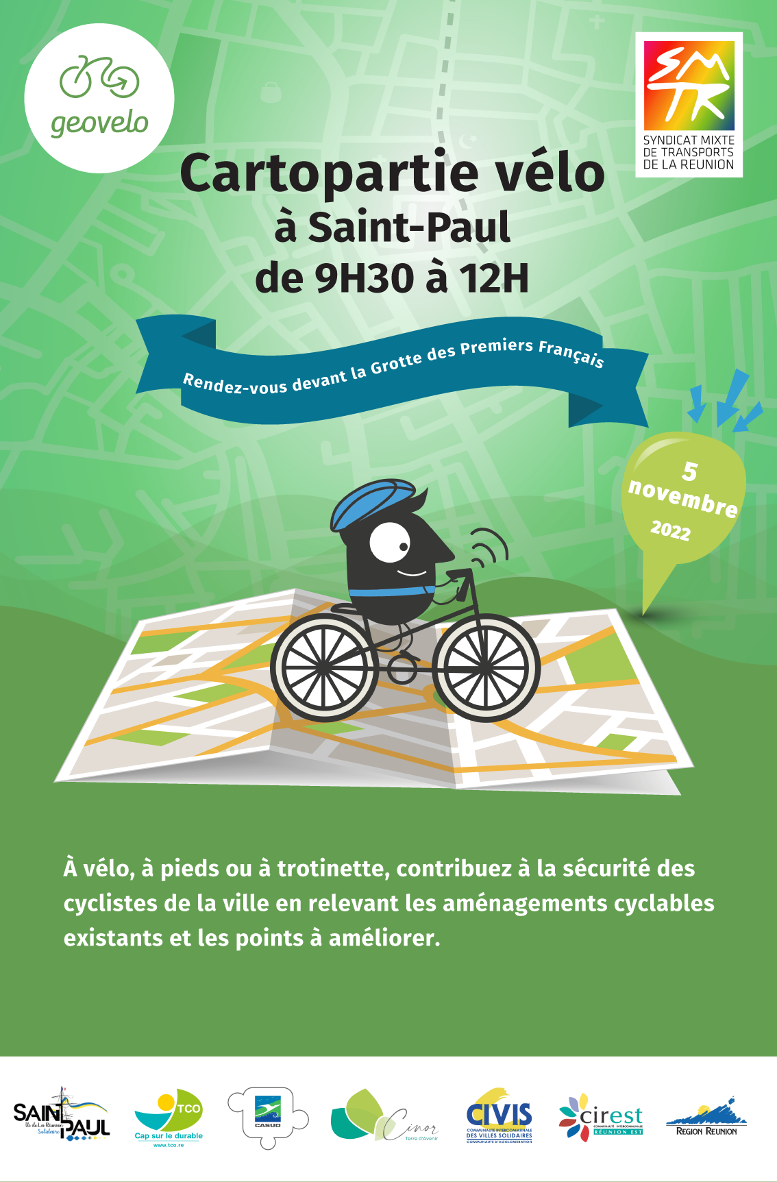 Le Syndicat Mixte des transports de La Réunion ( SMTR) et le TCO organisent deux cartoparties VÉLO sur la commune de Saint-Paul, à la Grotte du Peuplement, et sur la commune de la Possession, place Festival, le Samedi 5 Novembre 2022 de 9h30 à 12h00 .