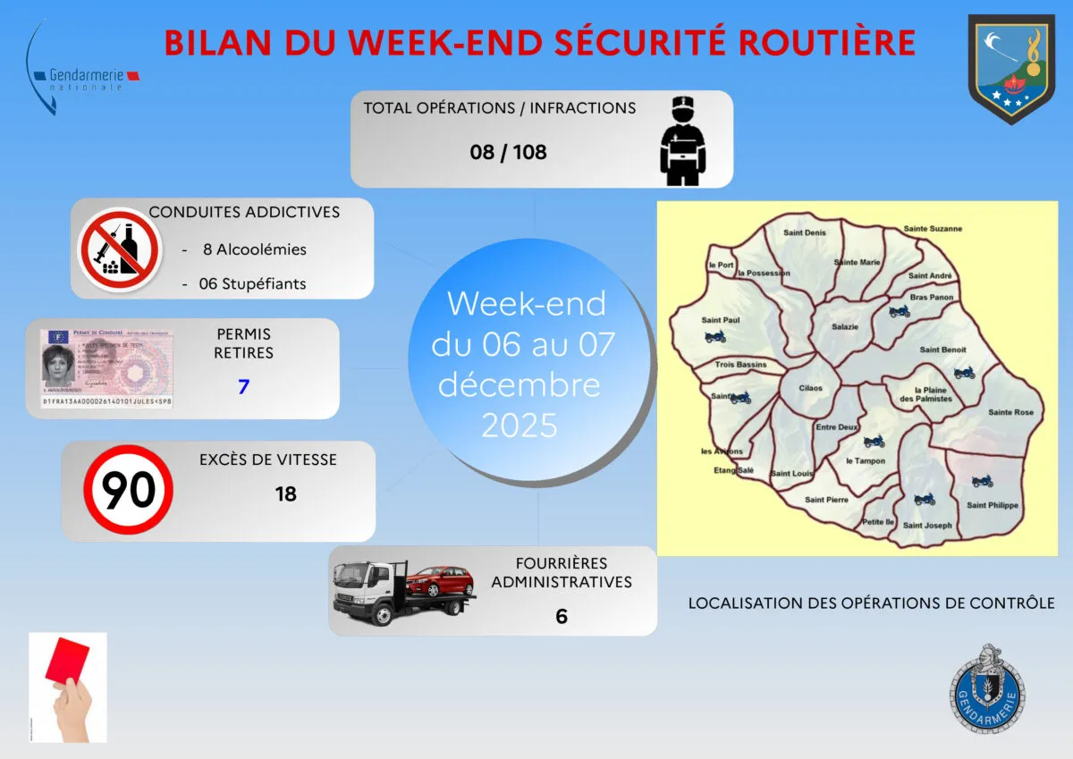 Les effectifs de la Direction Territoriale de Police Nationale de La Réunion ont réalisé sur le département 24 opérations de sécurisation et de sécurité routière au cours de ce week-end du 26 au 28/12/2025 permettant de relever 100 infractions dont 12 délits :