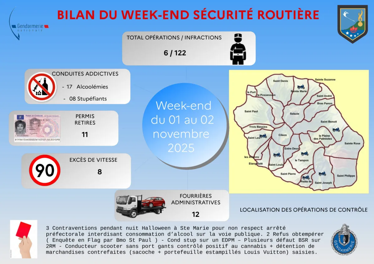 Les effectifs de la Direction Territoriale de Police Nationale de La Réunion ont réalisé sur le département 17 opérations de sécurisation et de sécurité routière au cours de ce week-end du 31 au 02/11/2022 permettant de relever