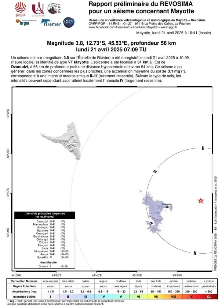 Un tremblement de terre de magnitude 3.8 a été enregistré ce lundi 21 avril 2025 à 10h09, heure locale à Mayotte. Selon le Réseau de surveillance volcanologique et sismologique de Mayotte (REVOSIMA), l’épicentre a été localisé à 31 km à l’Est de Dzaoudzi, à une profondeur de 56 km.