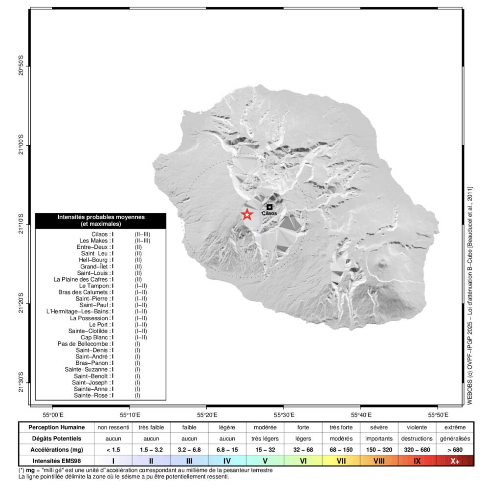 •Localisation : L’épicentre du séisme a été identifié à 5 km à l’ouest-sud-ouest de Cilaos, à une profondeur de 11 km, soit une distance hypocentrale d’environ 12 km.