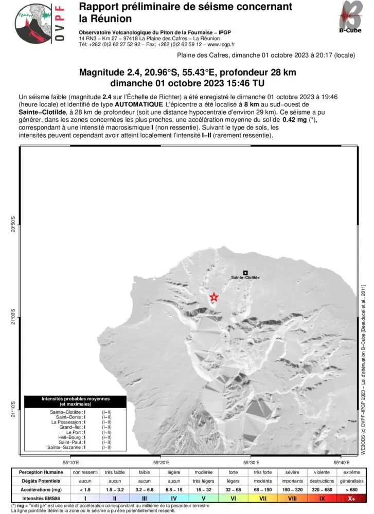 Ce dimanche 01 octobre 2023, à 19:46 (heure locale – soit 15:46 TU), un séisme a été perçu par les résidents de l’île, principalement dans le nord et la région de Salazie.