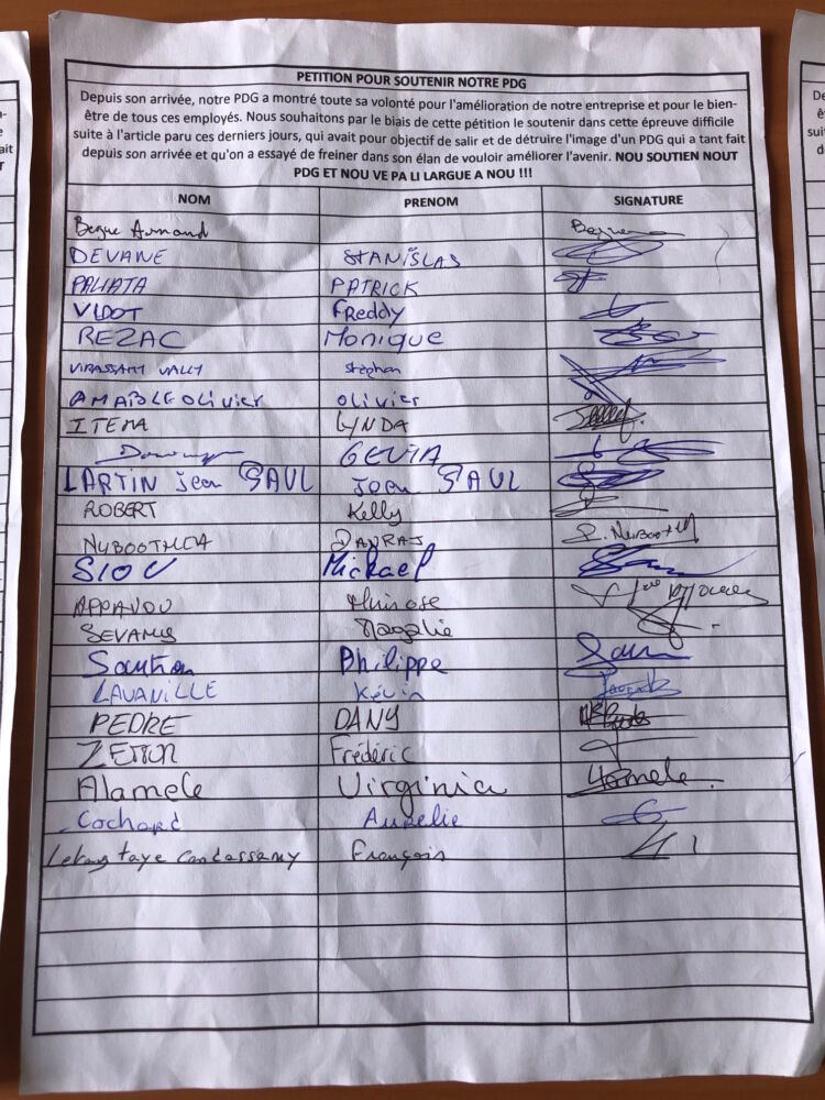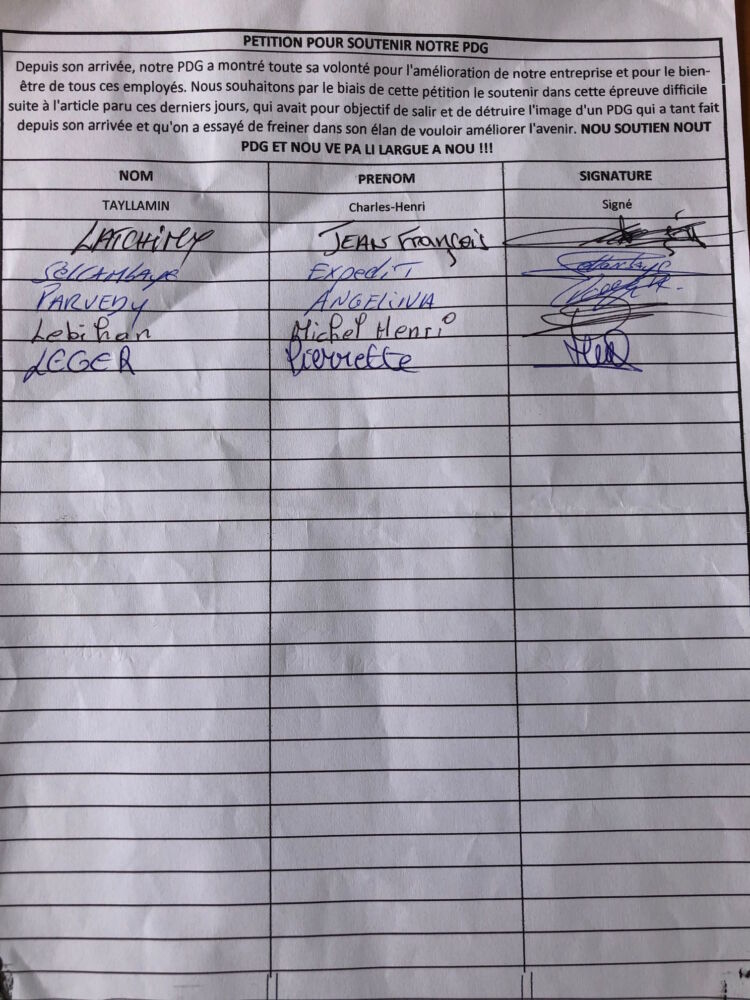 Et ces mêmes salariés, qui n’étaient pas tous présents, ce vendredi matin 4 juin 2021, en raison de l’heure du rendez-vous fixé aux environs de 11 heures sur le site de Paniandy à Bras-Panon, de préciser : « concernant la voiture de fonction, nous tenons à rappeler qu’avant Mr Alamélou, Mr Clain, le directeur, roulait en Koleos neuve, qui doit aussi avoir son prix. Nous rappelons également que Mr Alamélou a un salaire qui, annuellement, est inférieur de 20 000 à 25 000 € par rapport à celui de l’ancien directeur».