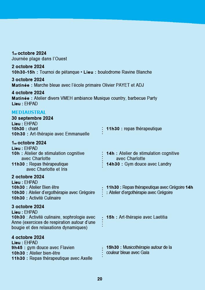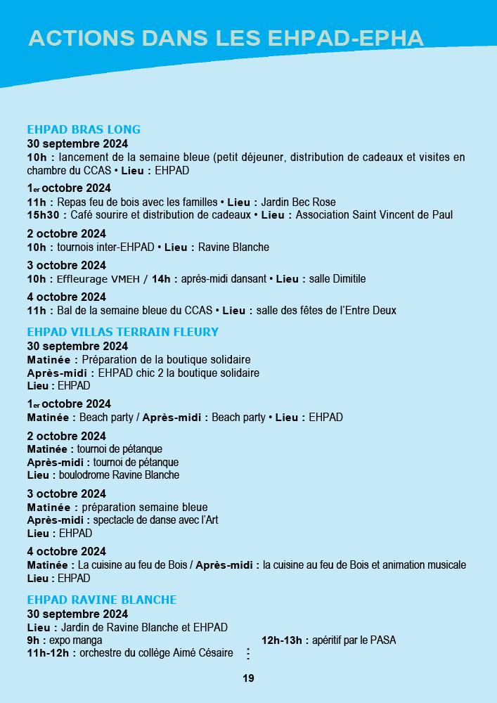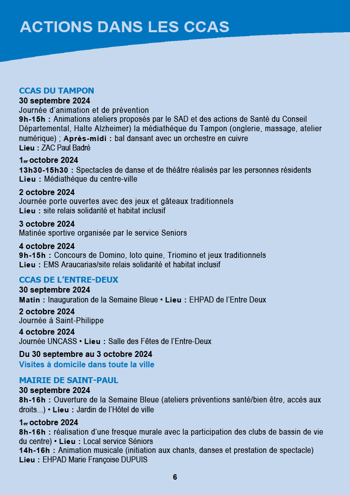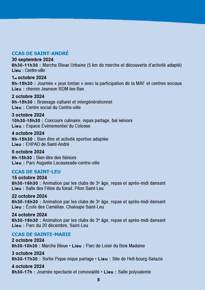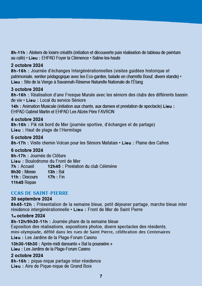 - CCAS de Saint-Pierre : La semaine débute avec une marche bleue intergénérationnelle le 30 septembre au front de mer, suivie d’une exposition et d’un « Bal la poussière » aux Jardins de la Plage. Les animations se poursuivront jusqu’au 5 octobre avec des piques-niques partagés et des animations dans les résidences.
