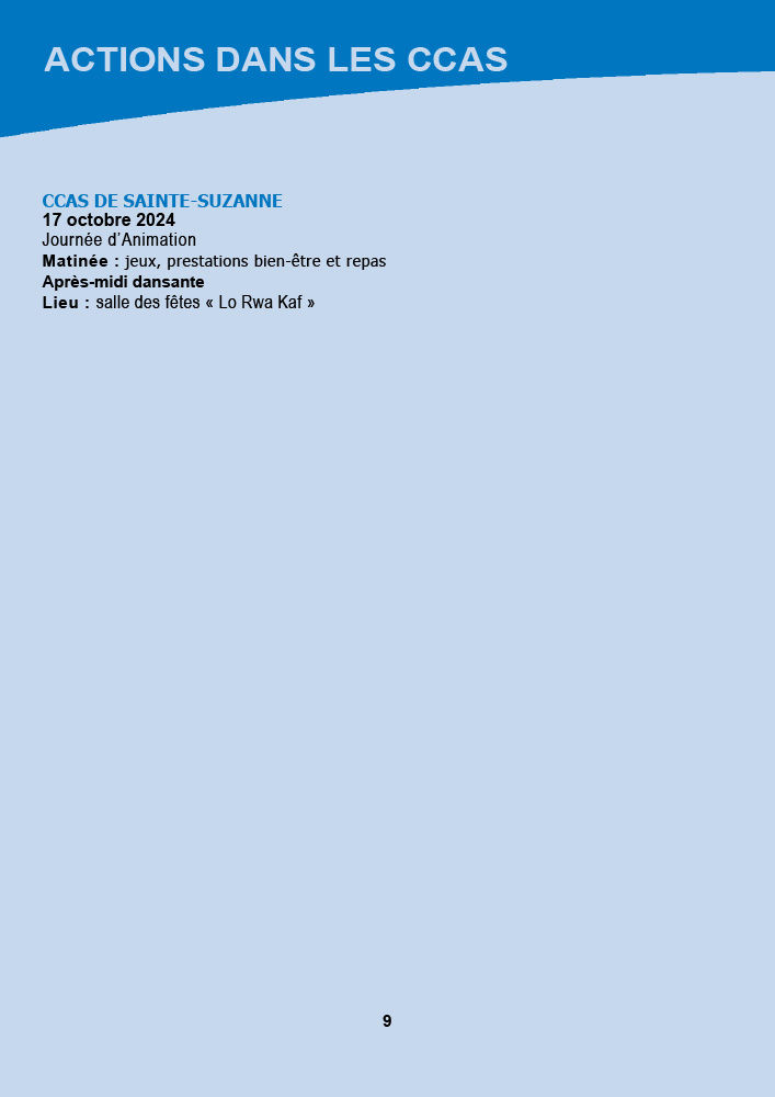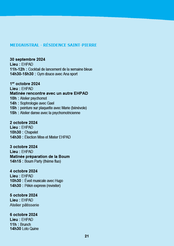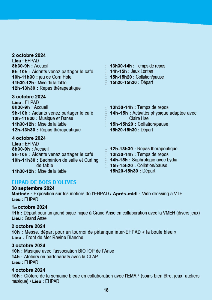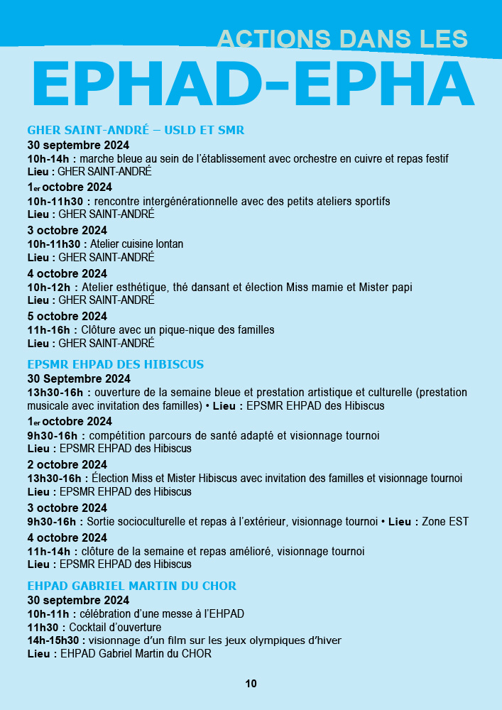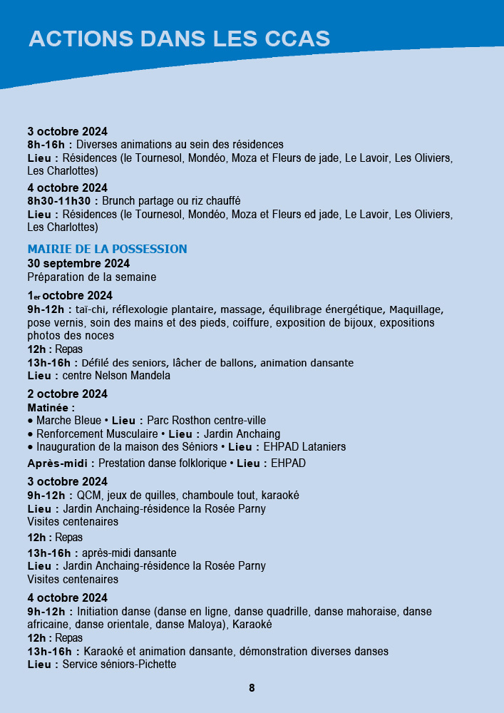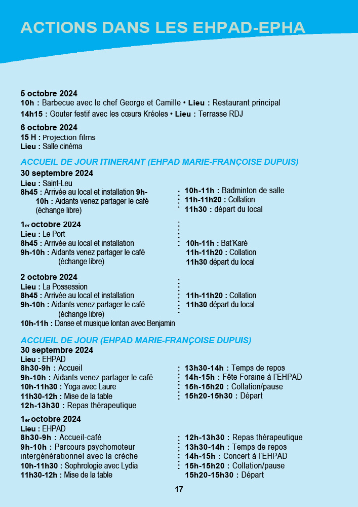- CCAS de Saint-Pierre : La semaine débute avec une marche bleue intergénérationnelle le 30 septembre au front de mer, suivie d’une exposition et d’un « Bal la poussière » aux Jardins de la Plage. Les animations se poursuivront jusqu’au 5 octobre avec des piques-niques partagés et des animations dans les résidences.