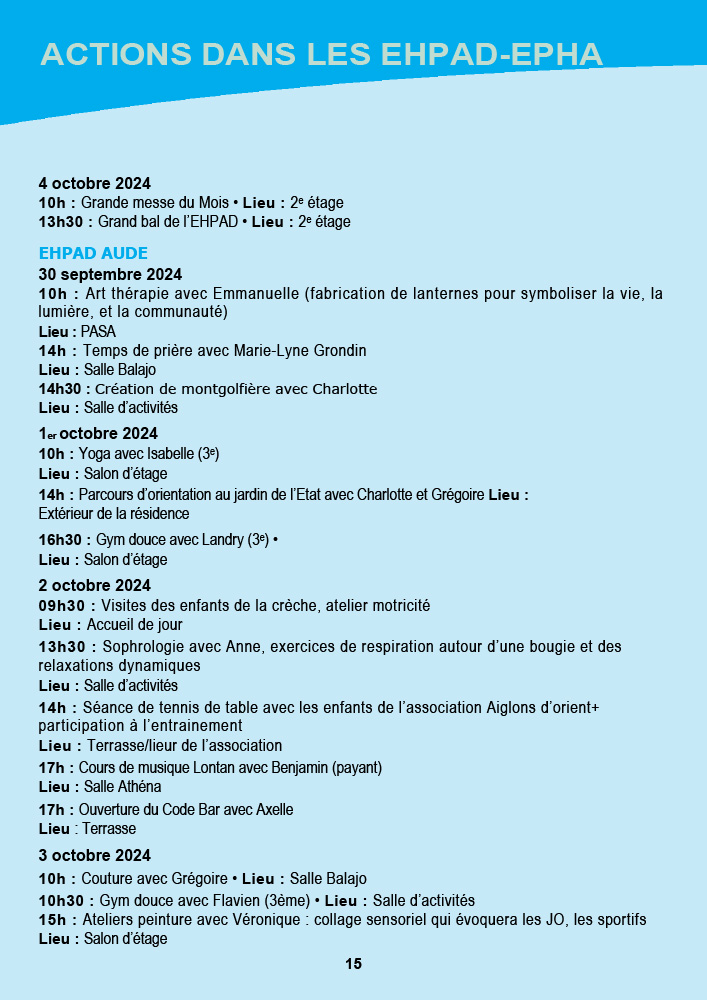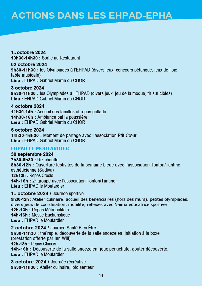 Dans les EHPAD, des activités variées telles que des concours culinaires, des ateliers bien-être, et des olympiades intergénérationnelles viendront rythmer la semaine. L’EHPAD Gabriel Martin proposera des olympiades et des projections de films, tandis que l’EHPAD Moutardier mettra l’accent sur la musique, les danses et des repas thématiques chaque jour.