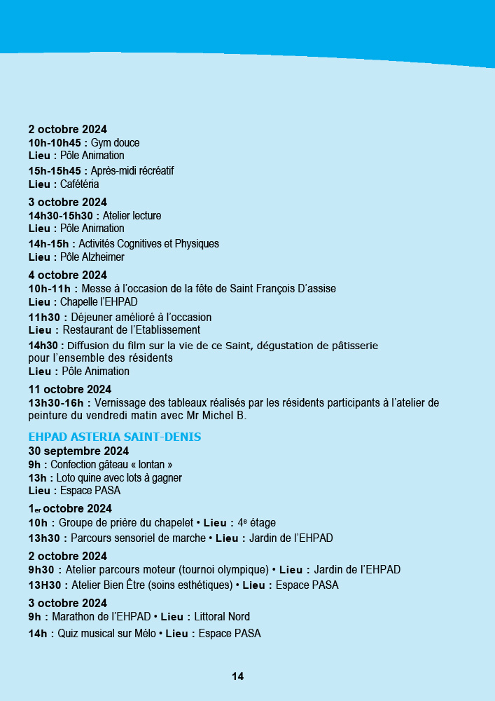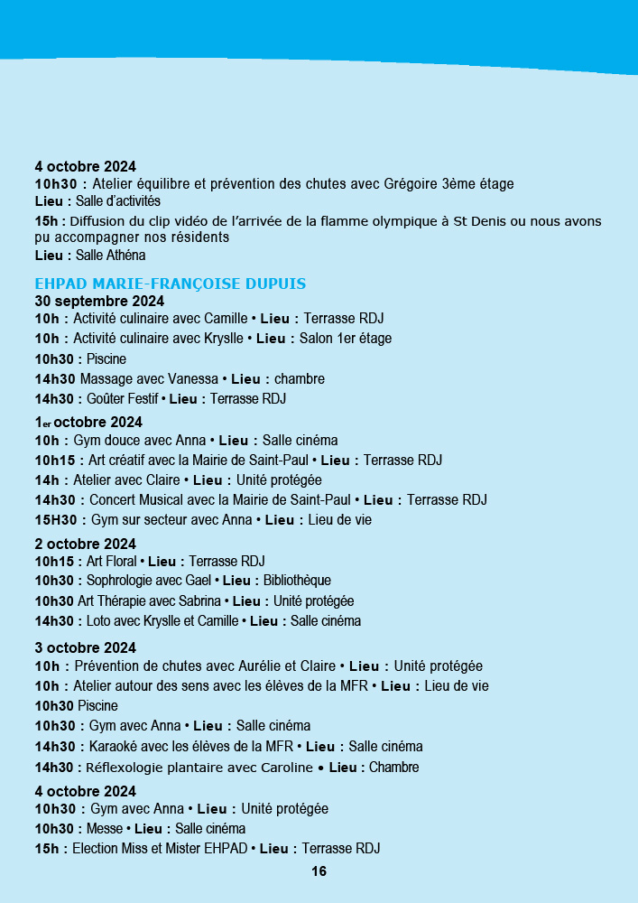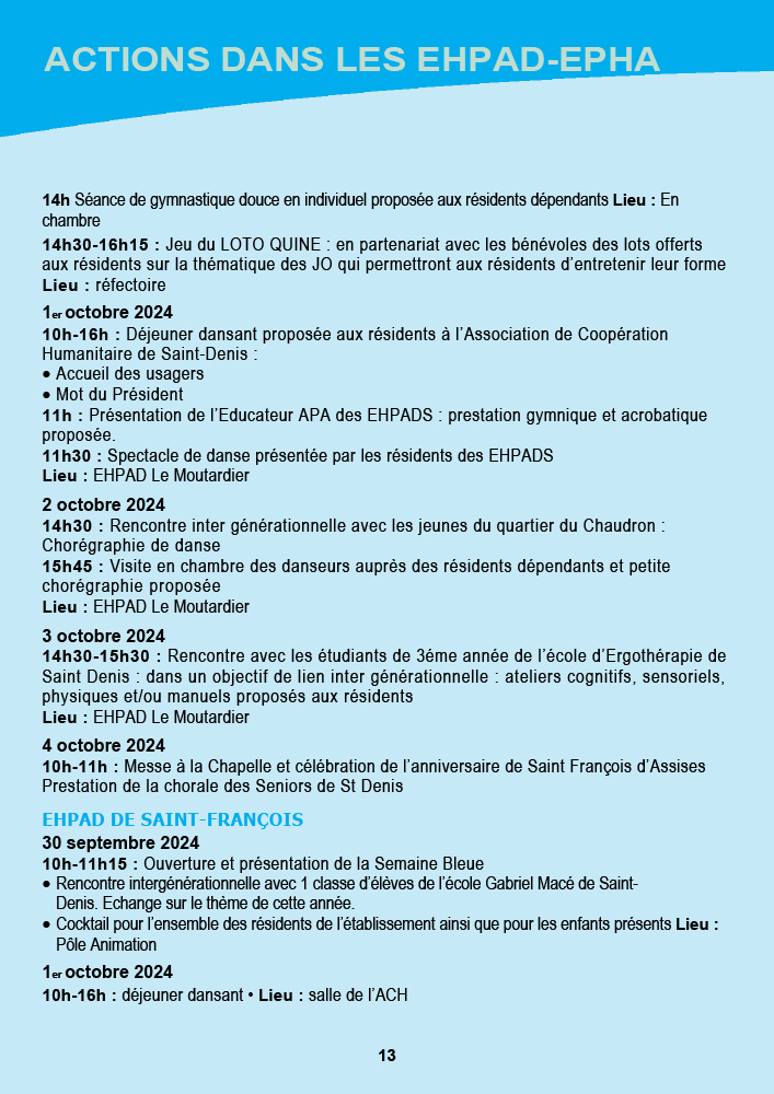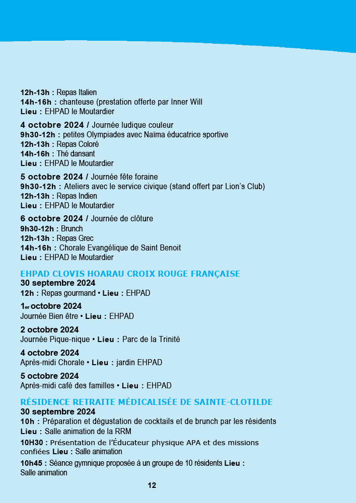 - Saint-Leu organise une fresque murale avec ses seniors, suivie d’une animation musicale avec l’EHPAD Gabriel Martin et un grand pique-nique à l’Hermitage pour conclure la semaine.