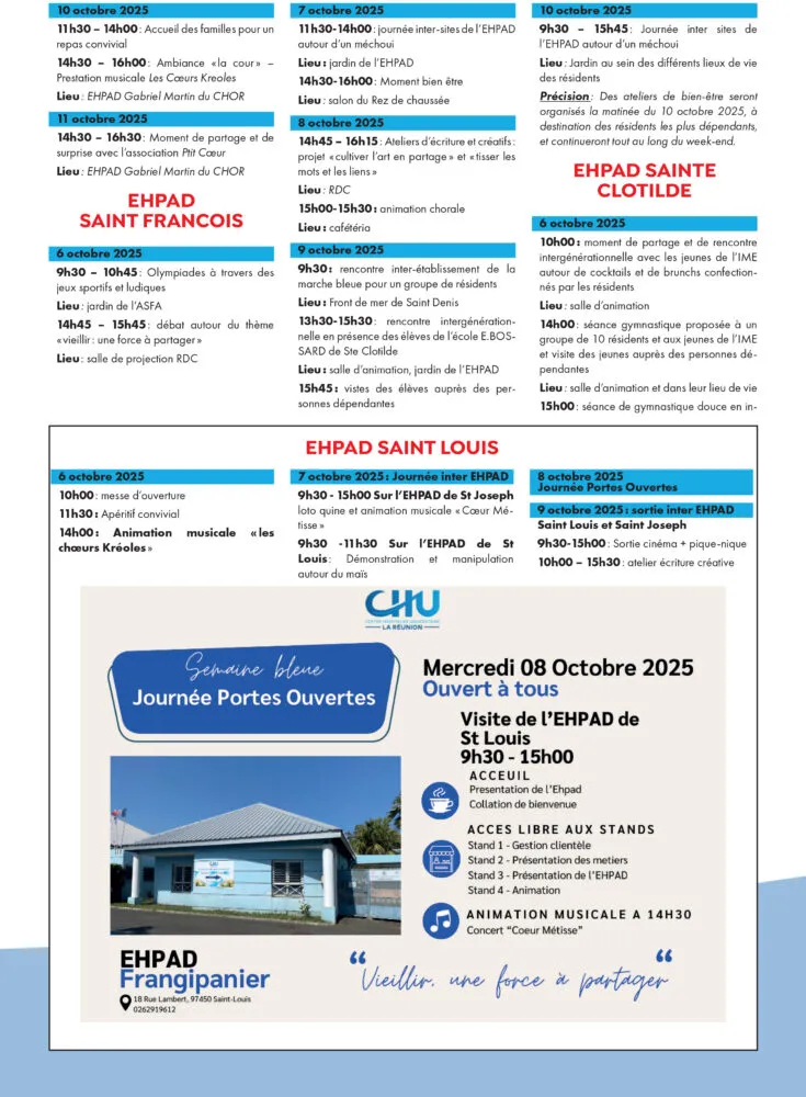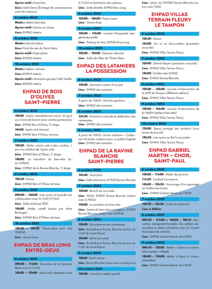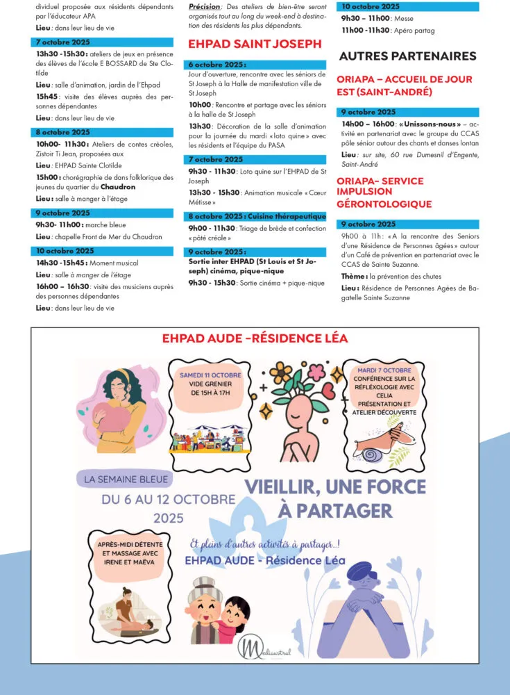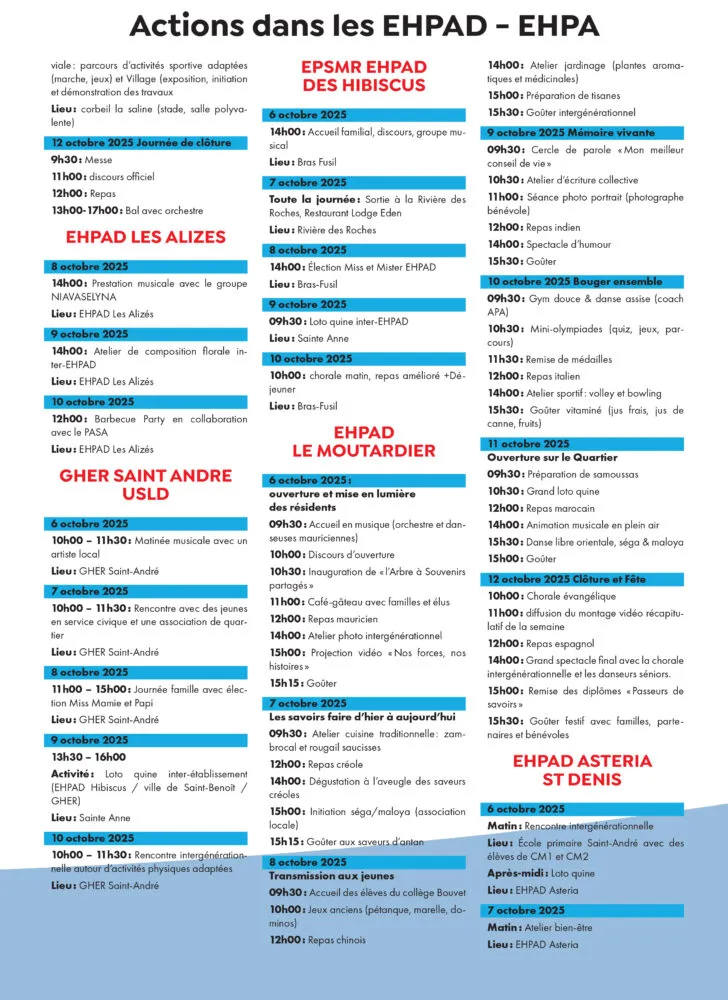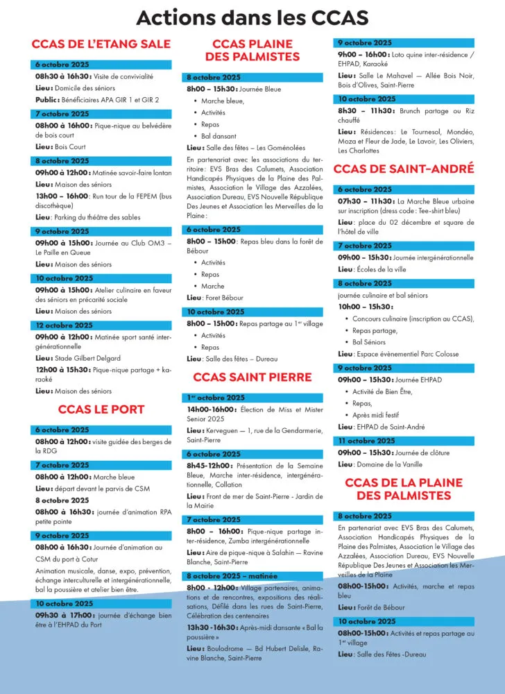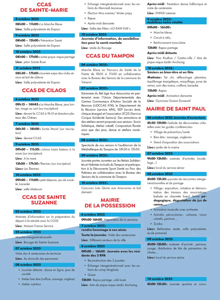Au programme, des activités variées et conviviales : marches bleues, ateliers bien-être, journées culinaires, bals, expositions et pique-niques partagés. À Saint-Pierre, Saint-André, Cilaos ou encore Sainte-Marie, les animations s’enchaîneront dans les résidences et les espaces publics. Les CCAS mettront également l’accent sur la prévention santé et le lien social, avec des initiatives originales comme les “run tours”, concours culinaires ou spectacles intergénérationnels.
