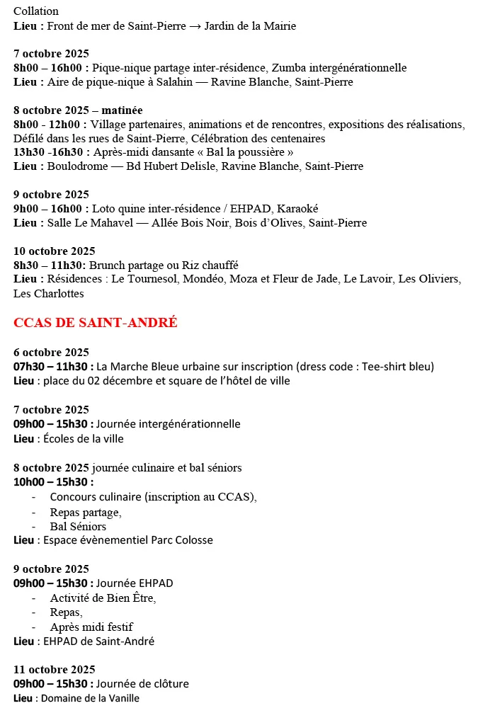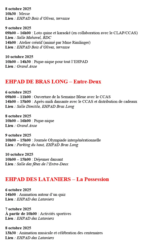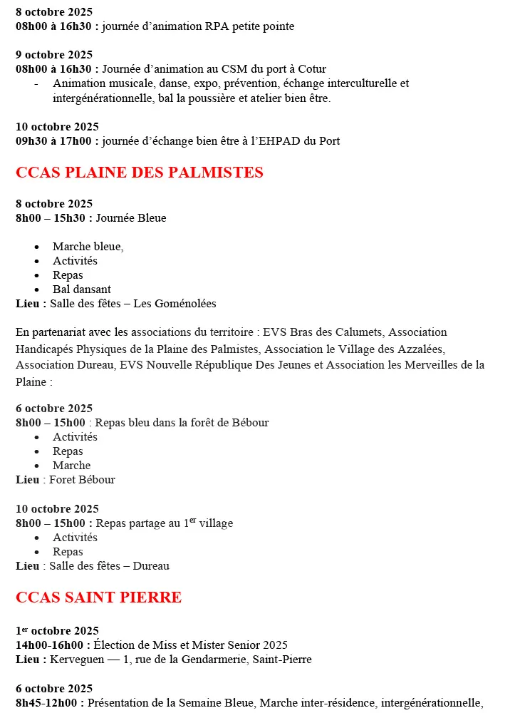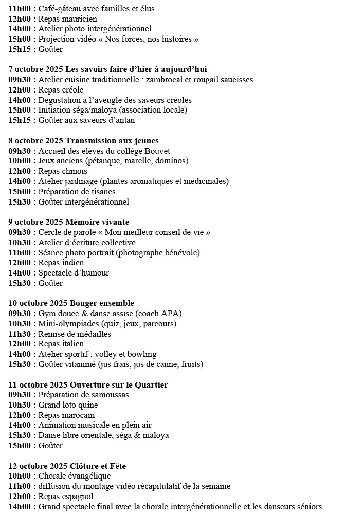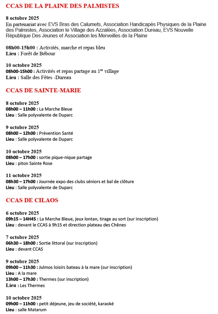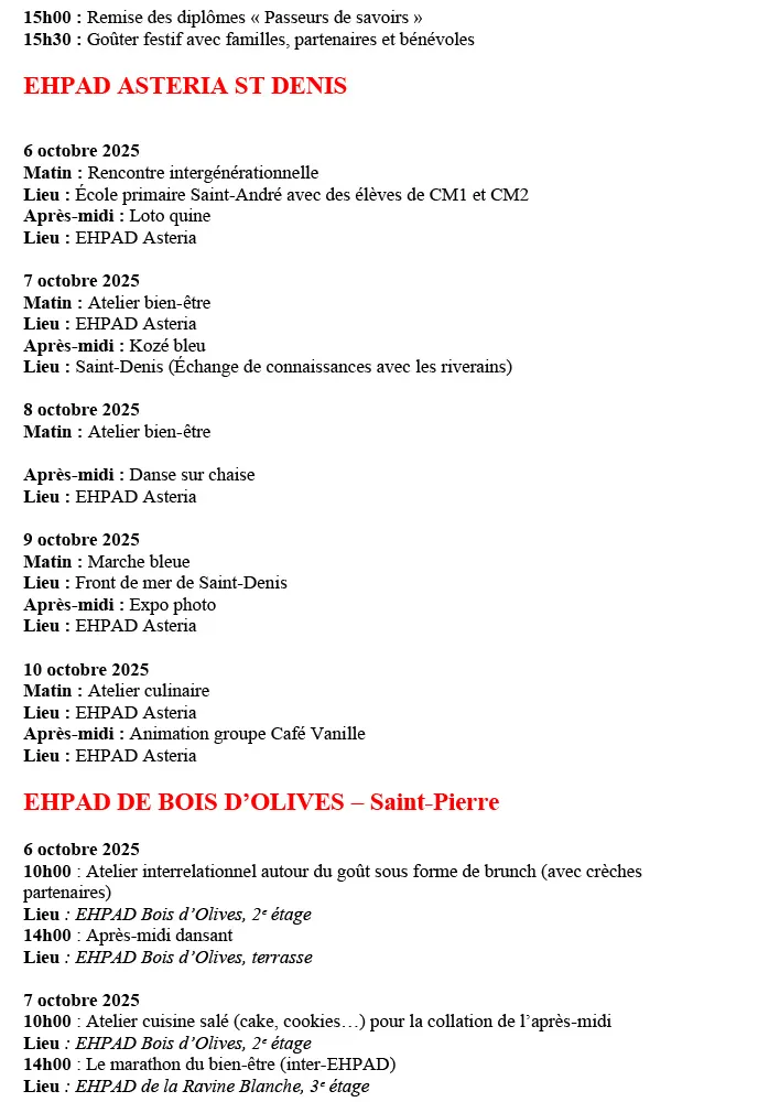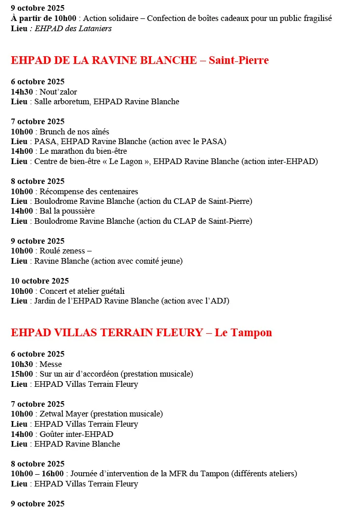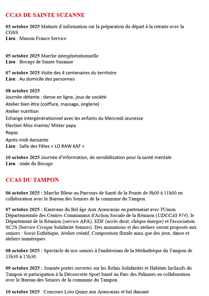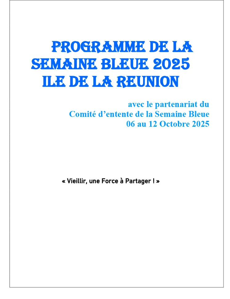 Collectivités/Conseil Départemental Semaine bleue 2025, rendez-vous du 6 au 12 octobre pour célébrer les seniors autour du thème ‘Vieillir, une force à partager ! par Céline Hardelain 1 octobre 2025 1 min de lecture Semaine bleue 2025 se déploie du 6 au 12 octobre à La Réunion, temps fort consacré aux seniors avec animations, rencontres et partages autour du thème ‘Vieillir, une force à partager ! Ne manquez pas toute l’actualité de La Réunion ! Abonnez-vous à la newsletter de Free Dom ! Valider Partager Facebook Twitter Pinterest Linkedin Whatsapp Reddit Email Vous pourriez être intéressé par 29 décembre 2025 Point sur le réseau routier départemental, 29 décembre à 16H30 29 décembre 2025 Fortes pluies : appel à la plus grande prudence à Saint-Paul 29 décembre 2025 Intempéries : radiers submergés à Trois Bassins et à Saint-Paul Céline Hardelain Laisser un commentaire Annuler la réponseYour email address will not be published. Enregistrer mon nom, mon e-mail et mon site dans le navigateur pour mon prochain commentaire. Current ye@r * Leave this field empty Article précédent Le collège Joseph Suacot grand vainqueur de l’édition 2025 Article suivant Bas de la Rivière en fête : Fraternité, culture et droits pour tous (Photos) Articles récents... Hommage à Johnny Hallyday sur Free Dom 2 ce 5 décembre Mardi 30 décembre 2025 – Météo, éphéméride et horoscope du jour Saint-Joseph : découverte de 2337 plants de cannabis, arrestation de 2 individus Point sur le réseau routier départemental, 29 décembre à 16H30 Suicide sur le pont de la Rivière d’Abord : importante mobilisation des secours et des forces de l’ordre Radier submergé à Ilet Furcy : la route de Cilaos fermée à la circulation cette nuit Fortes pluies : appel à la plus grande prudence à Saint-Paul Saint-Gilles-les-Bains : une route impraticable, les riverains montent au créneau (VIDEOS) Très grands excès de vitesse : un délit passible de prison depuis le 29 décembre 2025 Fermeture temporaire du sentier de la Canalisation des Orangers (cirque de Mafate)