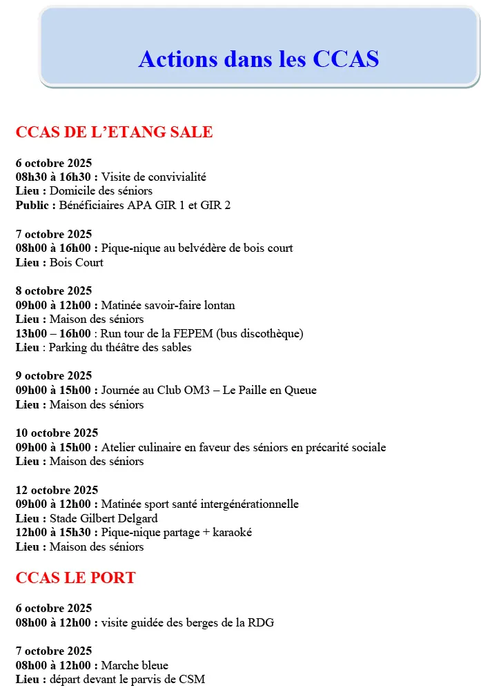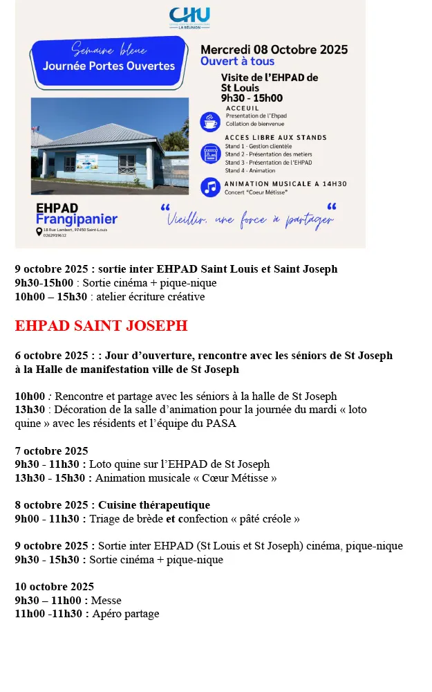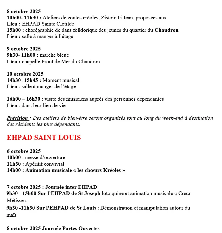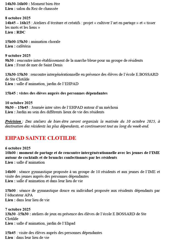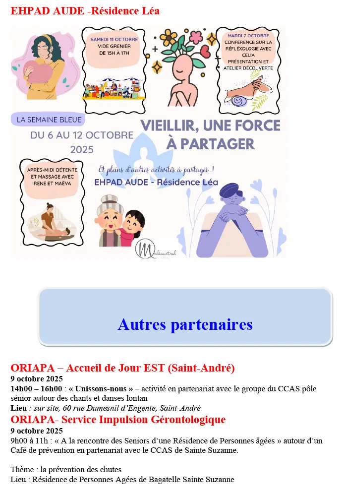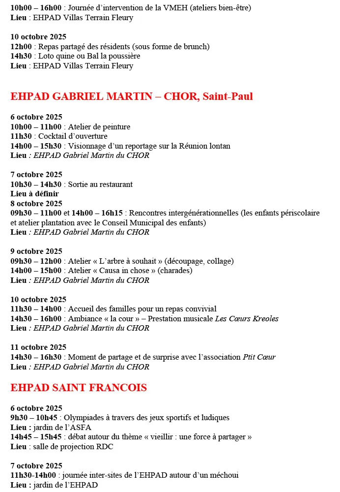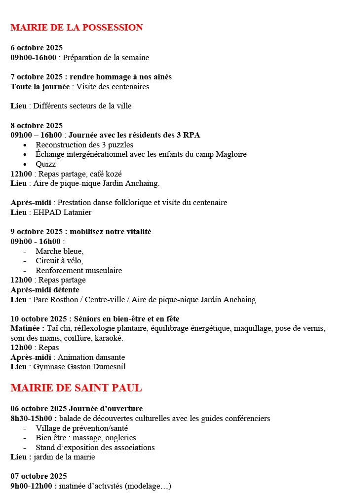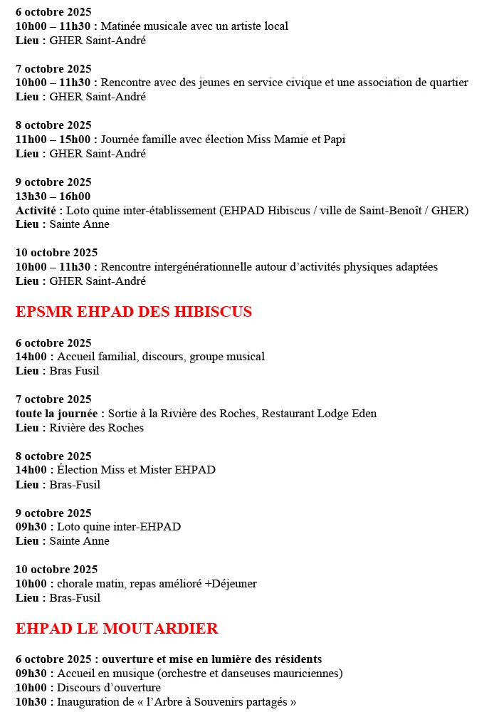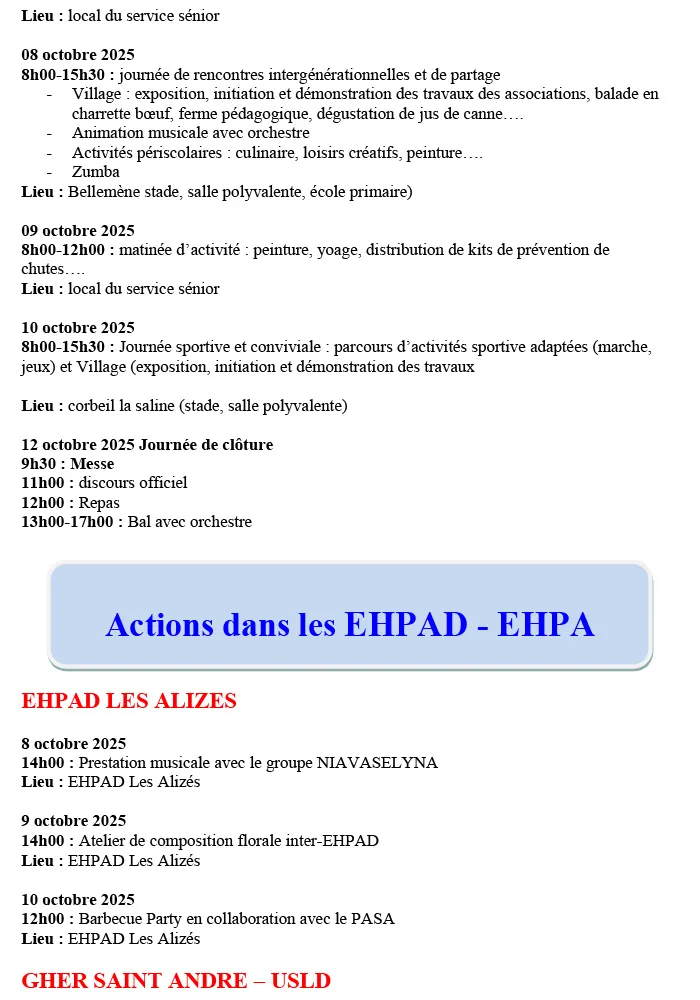 Collectivités/Conseil Départemental Semaine bleue 2025, rendez-vous du 6 au 12 octobre pour célébrer les seniors autour du thème ‘Vieillir, une force à partager ! par Céline Hardelain 1 octobre 2025 1 min de lecture Semaine bleue 2025 se déploie du 6 au 12 octobre à La Réunion, temps fort consacré aux seniors avec animations, rencontres et partages autour du thème ‘Vieillir, une force à partager ! Ne manquez pas toute l’actualité de La Réunion ! Abonnez-vous à la newsletter de Free Dom ! Valider Partager Facebook Twitter Pinterest Linkedin Whatsapp Reddit Email Vous pourriez être intéressé par 29 décembre 2025 Point sur le réseau routier départemental, 29 décembre à 16H30 29 décembre 2025 Fortes pluies : appel à la plus grande prudence à Saint-Paul 29 décembre 2025 Intempéries : radiers submergés à Trois Bassins et à Saint-Paul Céline Hardelain Laisser un commentaire Annuler la réponseYour email address will not be published. Enregistrer mon nom, mon e-mail et mon site dans le navigateur pour mon prochain commentaire. Current ye@r * Leave this field empty Article précédent Le collège Joseph Suacot grand vainqueur de l’édition 2025 Article suivant Bas de la Rivière en fête : Fraternité, culture et droits pour tous (Photos) Articles récents... Hommage à Johnny Hallyday sur Free Dom 2 ce 5 décembre Mardi 30 décembre 2025 – Météo, éphéméride et horoscope du jour Saint-Joseph : découverte de 2337 plants de cannabis, arrestation de 2 individus Point sur le réseau routier départemental, 29 décembre à 16H30 Suicide sur le pont de la Rivière d’Abord : importante mobilisation des secours et des forces de l’ordre Radier submergé à Ilet Furcy : la route de Cilaos fermée à la circulation cette nuit Fortes pluies : appel à la plus grande prudence à Saint-Paul Saint-Gilles-les-Bains : une route impraticable, les riverains montent au créneau (VIDEOS) Très grands excès de vitesse : un délit passible de prison depuis le 29 décembre 2025 Fermeture temporaire du sentier de la Canalisation des Orangers (cirque de Mafate)