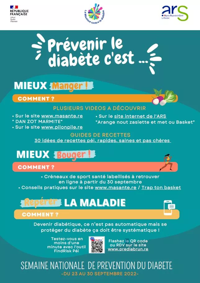 Différentes actions sont proposées aux Réunionnais au cours de cette semaine afin de les informer et de les sensibiliser aux bonnes attitudes à adopter pour prévenir la maladie : mieux manger, mieux bouger et repérer les facteurs de la maladie. Cet événement est l’occasion d’informer le grand public sur les facteurs de risques et sur les ressources existant pour prévenir le diabète.
