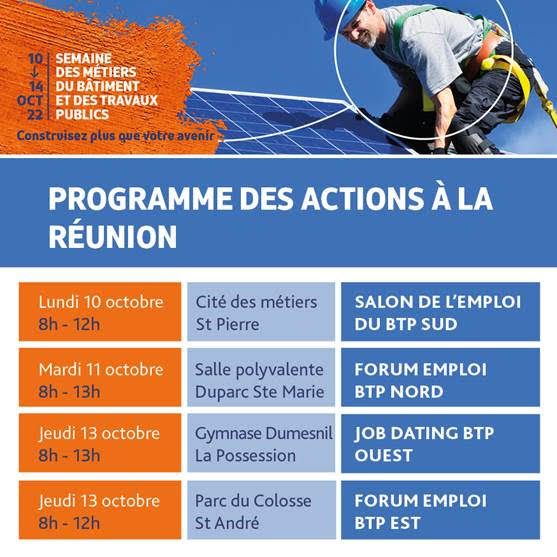 Ce lundi débute la semaine nationale des métiers du bâtiment et des travaux publics. A cette occasion, Pôle emploi Réunion, la FRBTP et la CAPEB organiseront des événements sur tout le territoire afin de mettre en avant l’attractivité de cette filière incontournable, de faire connaître les formations, les métiers et de faciliter les recrutements des entreprises.