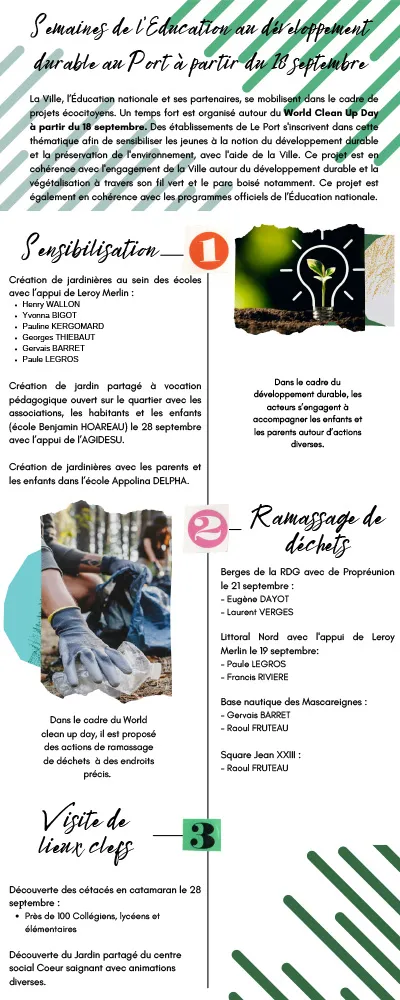 À l’occasion de la Semaine européenne du développement durable, du 18 septembre au 8 octobre 2023, la Ville du Port organise les Semaines de l’Éducation au développement durable à destination de ses scolaires. Ainsi, la Commune, l’Éducation nationale et ses partenaires se mobilisent dans le cadre de projets écocitoyens.