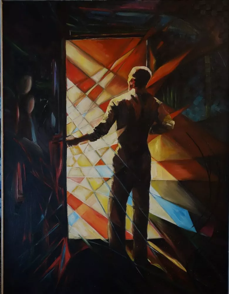 « Les carrés tectoniques qui façonnent l’écorce de mon univers et les visages de mes personnages, donnent à mes peintures leur vie distinctive et mon style vibrant », nous dit l’artiste.