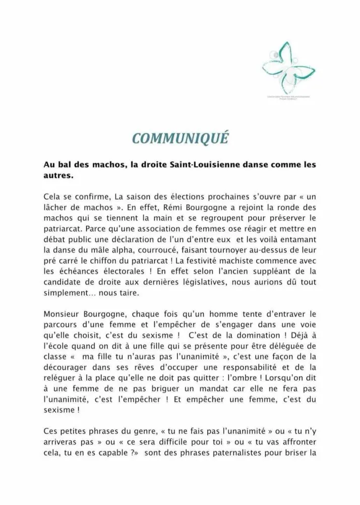 Votre communiqué est un procès d’intention. Une diversion. Il n’éclaire rien. Il masque. Je continuerai à dire ce que je pense. À défendre un féminisme libre, sérieux, solide. Pas un féminisme de circonstance. Pas un féminisme d’appareil. La cause est trop importante pour être instrumentalisée. Et les citoyennes, trop intelligentes pour être dupes ».