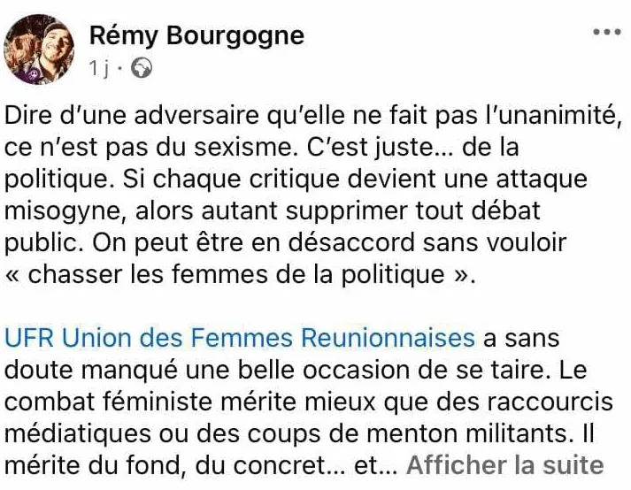 Ce concurrent ose déclarer qu’il a eu “le courage de lui dire que sa candidature ne fera pas l’unanimité. J’ai dû toucher son ego.” Mais Monsieur ce n’est pas “un ego” que vous touchez, c’est à l’ensemble des femmes réunionnaises que vous portez attaque ! Ce n’est pas du courage que vous avez, mais la volonté de chasser les femmes de l’espace politique !