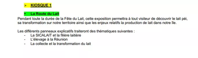 Exposition installée dans le kiosque 1 des Grands Kiosques, pendant toute la durée de la Fête du Lait, elle permettra à tout visiteur de découvrir le lait péi, sa transformation sur notre territoire ainsi que les enjeux relatifs la production de lait dans notre île.
