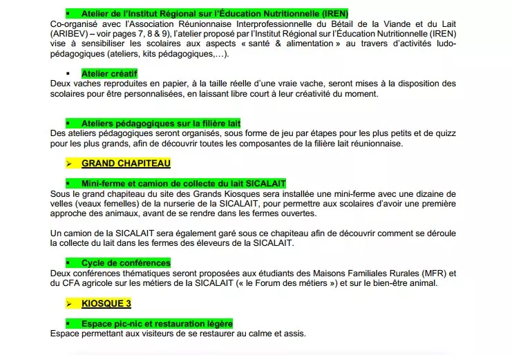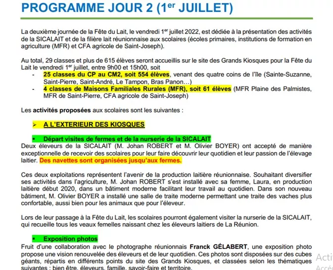 - Vendredi 1er juillet 2022 : journée de découverte de la filière lait réunionnaise et des métiers de l’élevage laitier à destination des jeunes générations (écoles primaires, institutions de formation en agriculture (Maisons Familiales Rurales – MFR