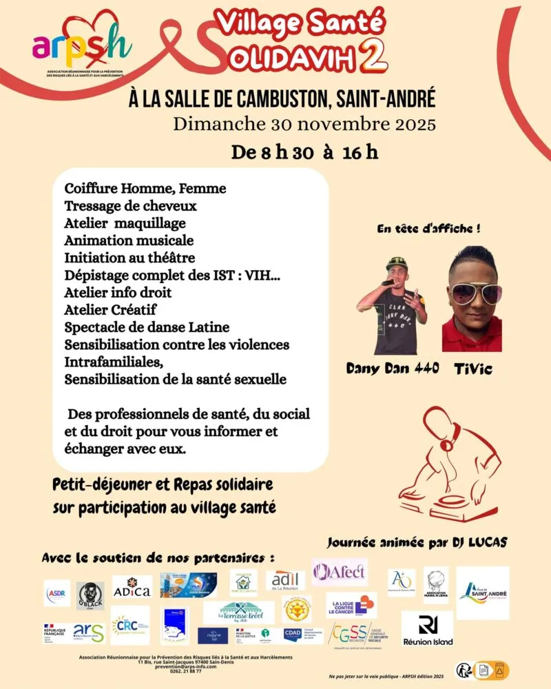 Le Village de Santé Solidavih revient pour sa deuxième édition ce dimanche 30 novembre 2025, à la salle Cambuston de Saint-André. L’événement, ouvert au public de 8h30 à 16h, s’inscrit dans une démarche de sensibilisation et de prévention autour du VIH, tout en proposant une journée conviviale et familiale.
