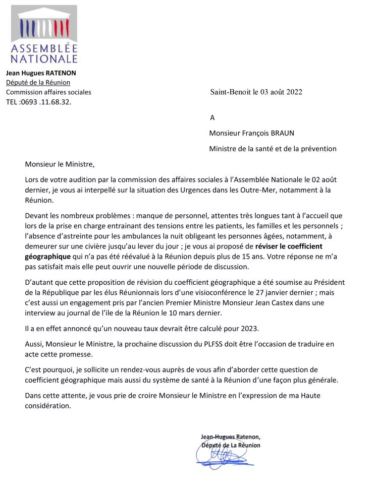 Le député de La Réunion, Jean-Hugues Ratenon, a interpellé le ministre de la Santé et de la Prévention, sur la situation dans les urgences des établissements sanitaires de La Réunion. Il a ainsi adressé un courrier à l’intention du ministre, François BRAUN.