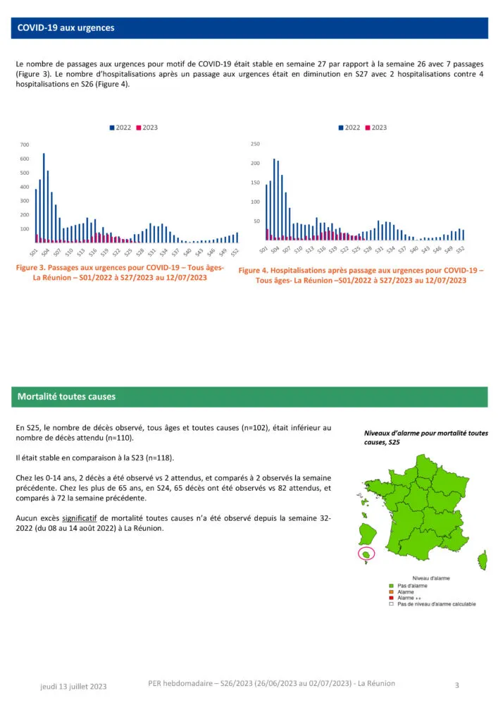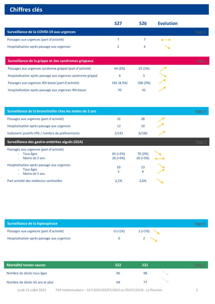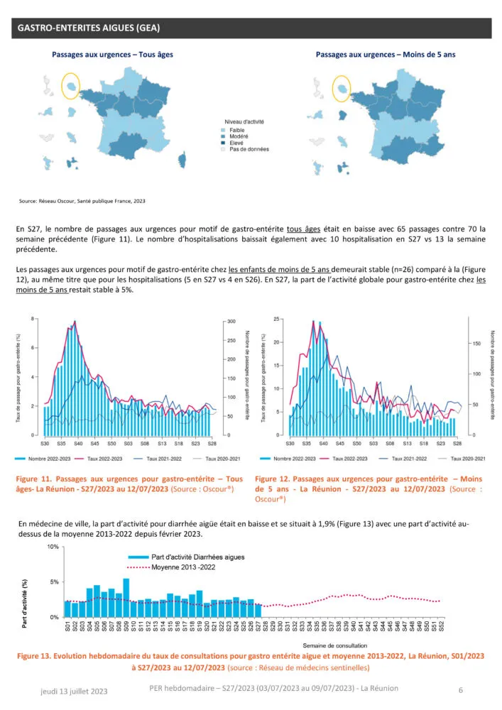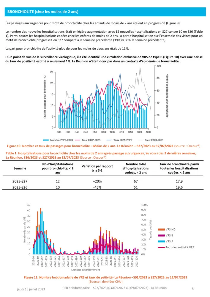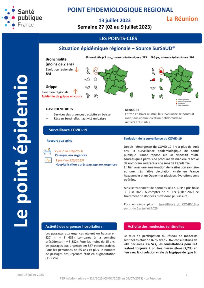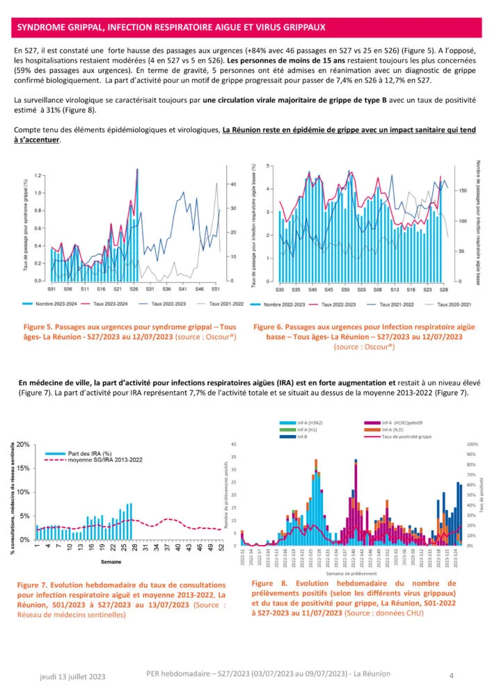 En S27, il est constaté une forte hausse des passages aux urgences (+84% avec 46 passages en S27 vs 25 en S26). A l’opposé, les hospitalisations restaient modérées (4 en S27 vs 5 en S26). Les personnes de moins de 15 ans restaient toujours les plus concernées (59% des passages aux urgences). En terme de gravité, 5 personnes ont été admises en réanimation avec un diagnostic de grippe confirmé biologiquement. La part d’activité pour un motif de grippe progressait pour passer de 7,4% en S26 à 12,7% en S27. La surveillance virologique se caractérisait toujours par une circulation virale majoritaire de grippe de type B avec un taux de positivité estimé à 31%. Compte tenu des éléments épidémiologiques et virologiques, La Réunion reste en épidémie de grippe avec un impact sanitaire qui tend à s’accentuer »