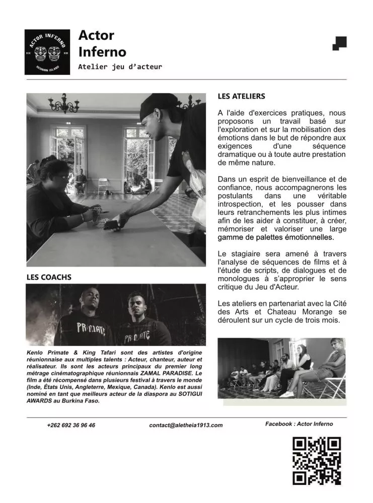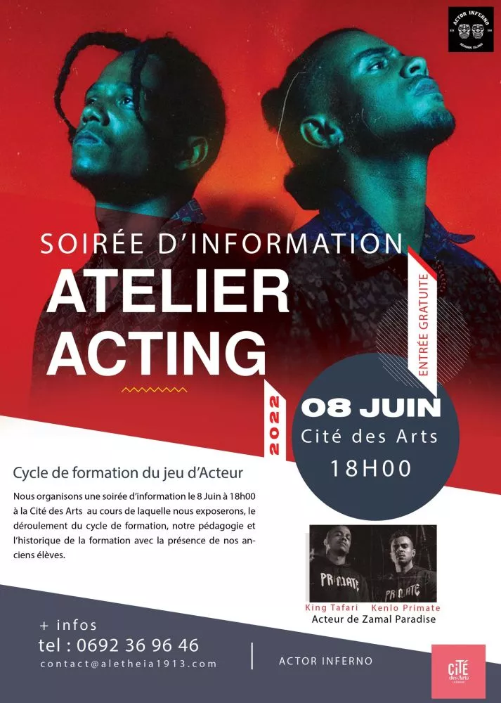 L’association Actor Inferno et la Cité des Arts vous convient à la présentation de la prochaine formation au jeu d’acteur proposée par King Tafari et Kenlo Primate, acteurs du long-métrage réunionnais Zamal Paradise.