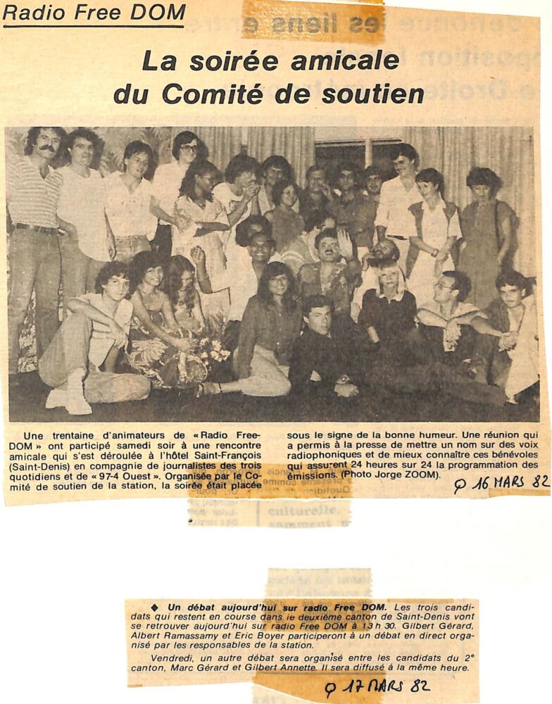 1982 Soirée amicale à l’hôtel Saint-François par La Rédaction 17 mars 1982 1 min de lecture On reconnaît notamment : Bernard, Alexis, Laurent Vergès, Albert Weber, Josiane Corvi, Solange Pieplu, Jacquy Clain, Pascaline, Benoît Ferrand, Guyto, Max Peverelly, Karine, Jean Pierre Juan, Henri Sylvestro, Alain Dupuis…etc… Ne manquez pas toute l’actualité de La Réunion ! Abonnez-vous à la newsletter de Free Dom ! Valider Partager Facebook Twitter Pinterest Linkedin Whatsapp Reddit Email Vous pourriez être intéressé par 10 décembre 1982 Un canular par jour sur Radio Free Dom 11 octobre 1982 L’émission « pas de canard sans navet » 7 octobre 1982 L’émission « bleu outre-mer ou la radio de la méduse… » La Rédaction Laisser un commentaire Annuler la réponseYour email address will not be published. Enregistrer mon nom, mon e-mail et mon site dans le navigateur pour mon prochain commentaire. Current ye@r * Leave this field empty Article précédent Cantonales 82 : « Radio Free Dom a mis le paquet » Article suivant Free Dom reçoit les journalistes de la presse écrite Articles récents... Hommage à Johnny Hallyday sur Free Dom 2 ce 5 décembre Mardi 30 décembre 2025 – Météo, éphéméride et horoscope du jour Saint-Joseph : découverte de 2337 plants de cannabis, arrestation de 2 individus Point sur le réseau routier départemental, 29 décembre à 16H30 Suicide sur le pont de la Rivière d’Abord : importante mobilisation des secours et des forces de l’ordre Radier submergé à Ilet Furcy : la route de Cilaos fermée à la circulation cette nuit Fortes pluies : appel à la plus grande prudence à Saint-Paul Saint-Gilles-les-Bains : une route impraticable, les riverains montent au créneau (VIDEOS) Très grands excès de vitesse : un délit passible de prison depuis le 29 décembre 2025 Fermeture temporaire du sentier de la Canalisation des Orangers (cirque de Mafate)