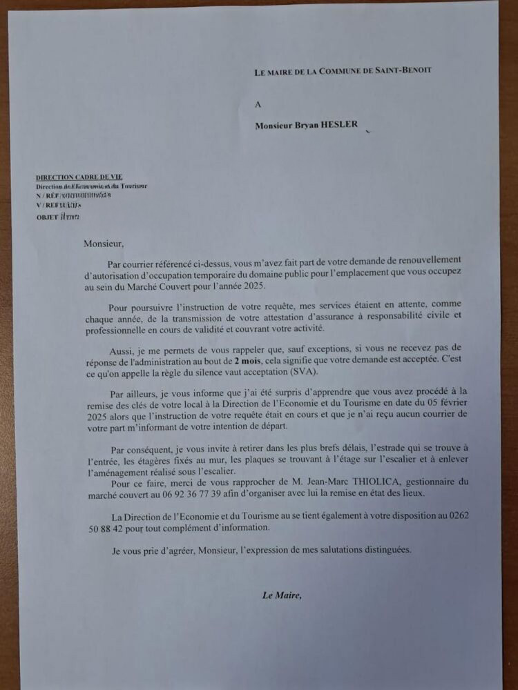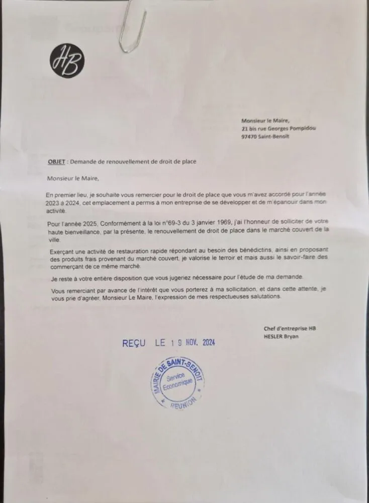 Direction Saint-Benoit à présent. Je vous relatais la semaine dernière l’histoire d’un jeune commerçant (et aussi militant de Ratenon), Bryan Dugain, en vous disant qu’il n’avait pas effectué sa demande de renouvellement auprès de la mairie. Il tenait un petit commerce dans le marché couvert de Saint-Benoit dans lequel il vendait, entre autres, des sandwichs américains. Bryan Dugain (fils d’Eric Hessler, avocat de Jean-Hugues Ratenon dans l’affaire de l’accident du 24 août 2023 à Sainte-Suzanne) m’a fait savoir que mes « sources n’étaient pas bonnes ». Il m’a envoyé le courrier qu’il avait adressé à la mairie.