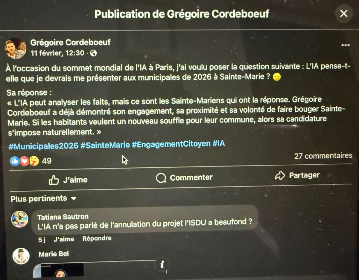 A Sainte-Marie, je vous ai parlé de Mathias Dassot la semaine dernière. Un jeune ambitieux. C’est tout à son honneur. Mais il ne serait pas le seul à vouloir être Calife à la place du Calife. J’ai vu un post assez marrant de Grégoire Cordebœuf, que je vous laisse lire :