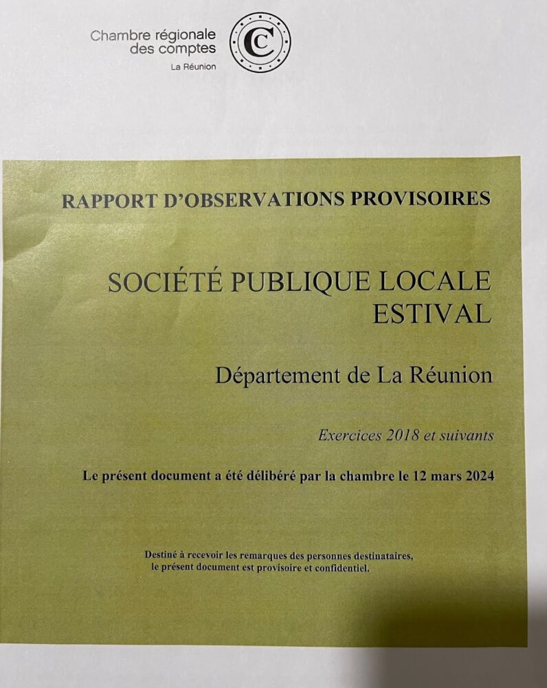 Comme le rappelle à chaque page du rapport la formule consacrée, il s’agit «d’un document confidentiel en cours de contradiction ». Le directeur de la CRC tient d’ailleurs à rappeler aux destinataires que «ce document revêt un caractère confidentiel qu’il vous appartient de protéger ». Comme vous pouvez le constater, j’ai pu me procurer un exemplaire de ce rapport provisoire. Compte-tenu de son caractère confidentiel, je ne vais pas vous le révéler dans les moindres détails mais, à première vue, tout ce qui est écrit dans ce rapport est déjà connu pour avoir été mis sur la place publique via les révélations faites l’année dernière par la presse locale, plus précisément par Le Quotidien de la Réunion et plus précisément par mon confrère Edouard Marchal.