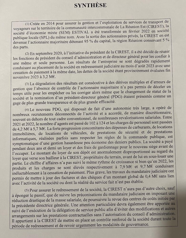 L’intérêt de ce rapport provisoire (j’insiste), c’est qu’il va en profondeur en s’appuyant sur des documents comptables et autres, sans doute parce que les « gendarmes des collectivités locales » que sont les magistrats de la Chambre régionale des comptes disposent de moyens qui ne sont pas les mêmes que ceux d’un cabinet d’audit privé. Je vais me limiter aux grandes lignes de ce rapport de la CRC, mais avant tout, petit rappel du contexte tel qu’il est précisé dans la note de synthèse de la CRC. Rappelons que Ludovic Alamélou, ancien conseiller municipal de Bras-Panon et conseiller communautaire de la Cirest, a été nommé Pdg de la Sem Estival en 2020, que sur initiative de la Cirest, mais sans l’aval de la municipalité de Saint-André, la Sem a été transformée en SPL en février 2022, financée à hauteur de 95% par la Cirest. Voir document ci-dessous :