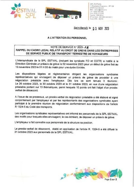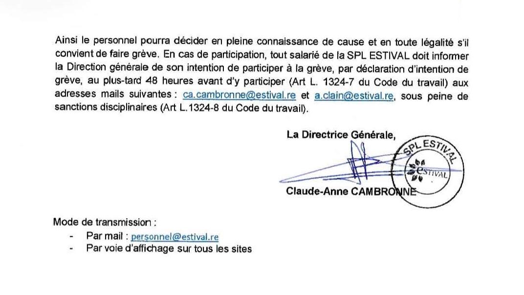 Après avoir reçu le préavis de grève, la direction de la SPL Estival a aussitôt réagi par une note de service qui, selon l’intersyndicale, « s’apparente à un coup de pression, à une intimidation » sur le personnel. Une note de service signée de la DGS Claude-Anne Cambronne. (Voir ci-dessous) :