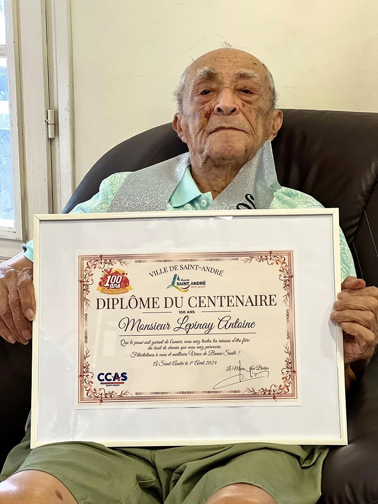 Actuellement en EHPAD à Saint-André, Antoine Lepinay fête ses 100 ans aujourd’hui. Il est né à l’Etang-Salé et a travaillé en tant que gardien de la mairie de Saint-Denis du temps d’Auguste Legros.