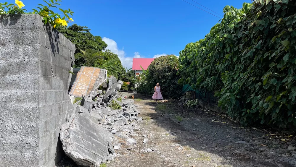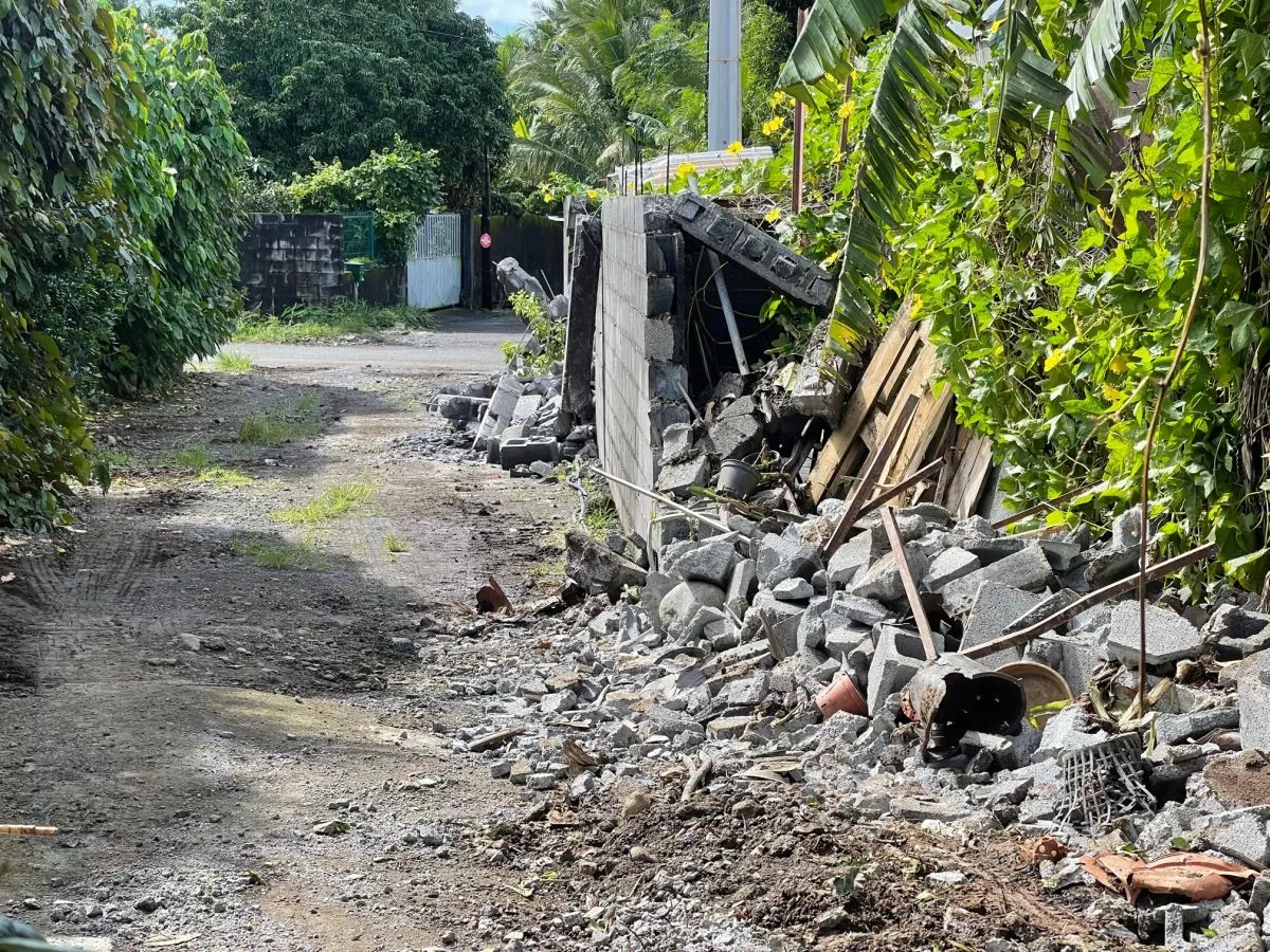 Une partie du mur des Pothin a été démolie par le tractopelle loué par la famille Sinacouty. Cette dernière estime que le mur des Pothin empiète sur leur propriété. (Crédit Photos : Yves Mont-Rouge)