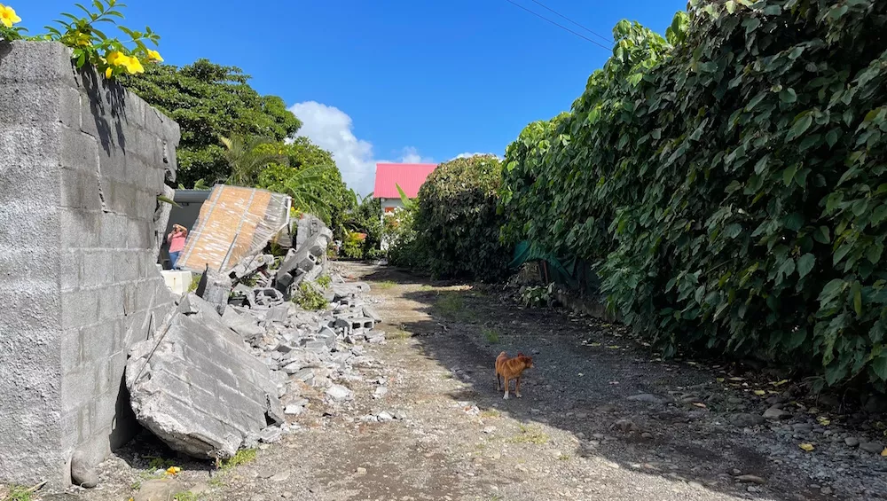 Une partie du mur des Pothin a été démolie par le tractopelle loué par la famille Sinacouty. Cette dernière estime que le mur des Pothin empiète sur leur propriété. (Crédit Photos : Yves Mont-Rouge)