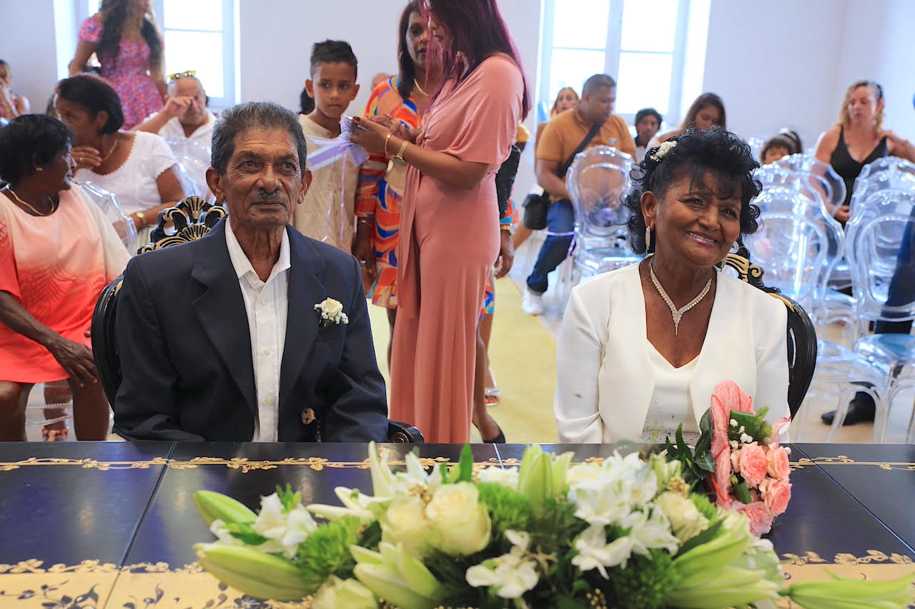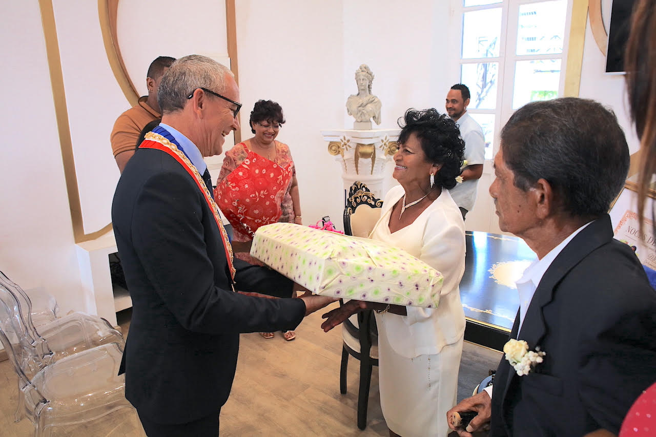 60 ans de mariage pour Marc Hugues DOBI et Louisette LATCHAYA. 60 ans d’amour et ils s’aiment toujours comme au premier jour. L’amour lé doux, même ! Marc Hugues et Louisette ont renouvelé leurs vœux de mariage, ce samedi 17 février, à l’Hôtel de Ville de Saint-André, devant monsieur le maire Joé BEDIER, qui leur a remis le diplôme de « NOCES DE DIAMANT » ainsi qu’un cadeau.