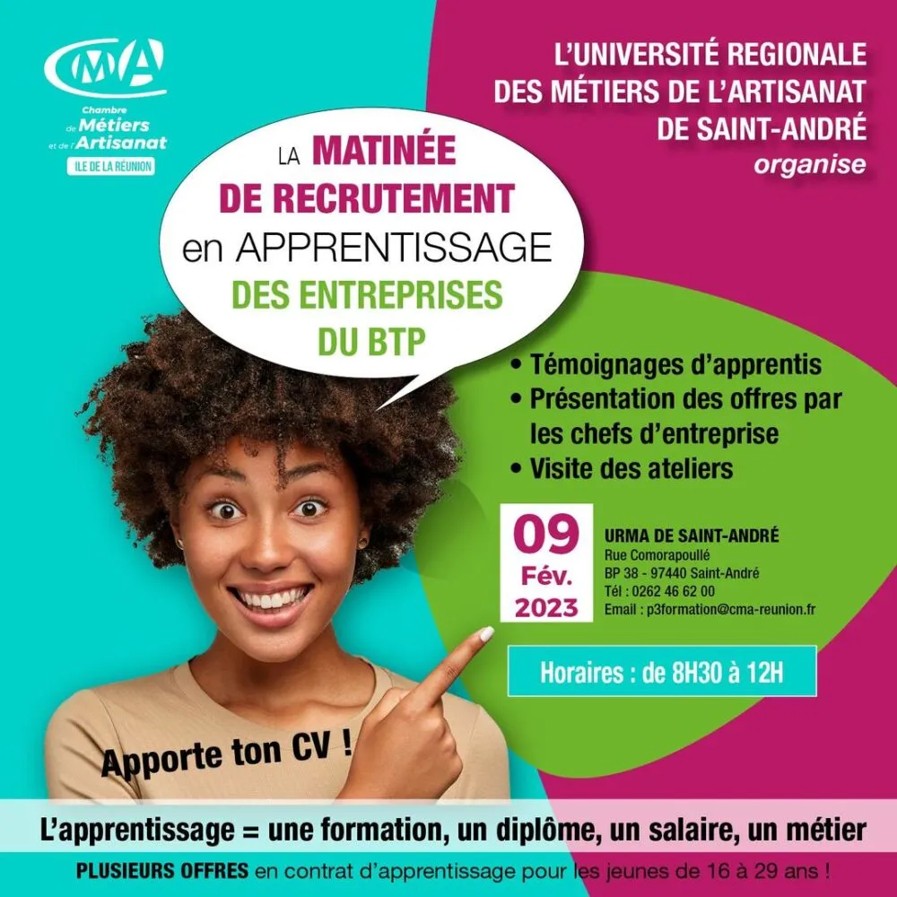 La Chambre de Métiers et de l’Artisanat Réunion organise une matinée de recrutement le 09 Février 2023 de 8h30 à 12h à l’URMA de Saint-André.