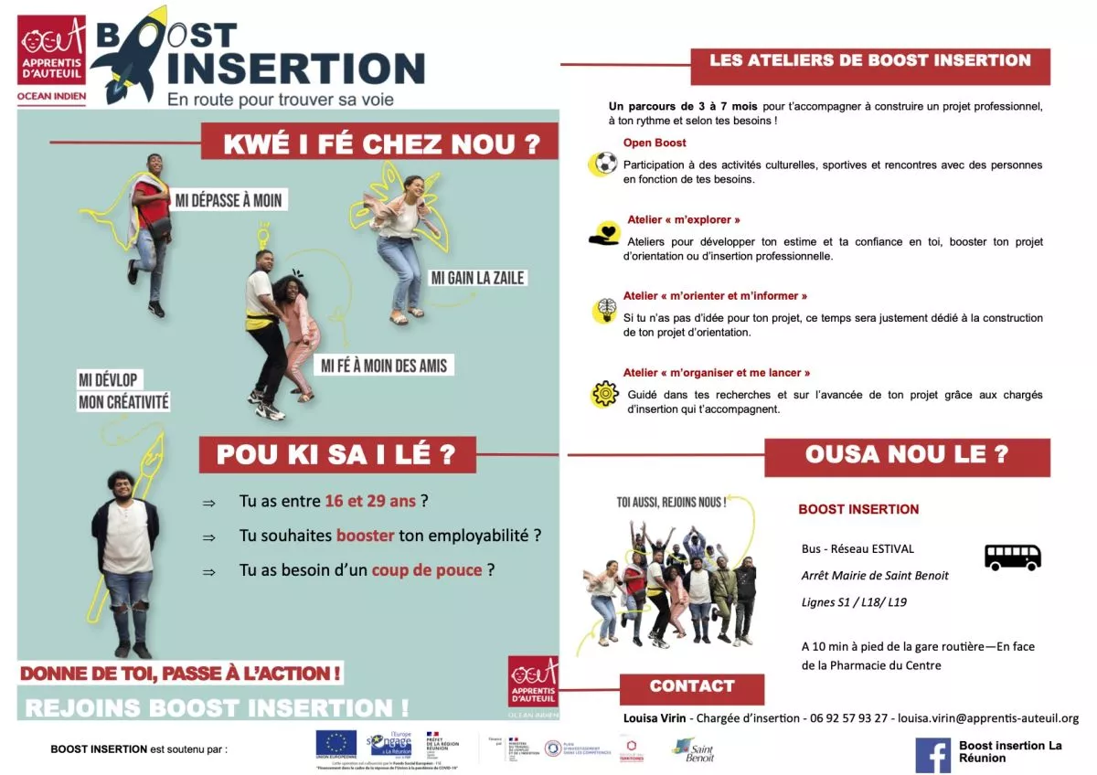 « Boost insertion » est désormais à Saint-Benoît ! Le programme Boost insertion est un dispositif porté par les Apprentis d’Auteuil Océan Indien. Il s’adresse aux jeunes de 16 à 29 ans souhaitant se relancer dans une dynamique de formation et d’insertion professionnelle.