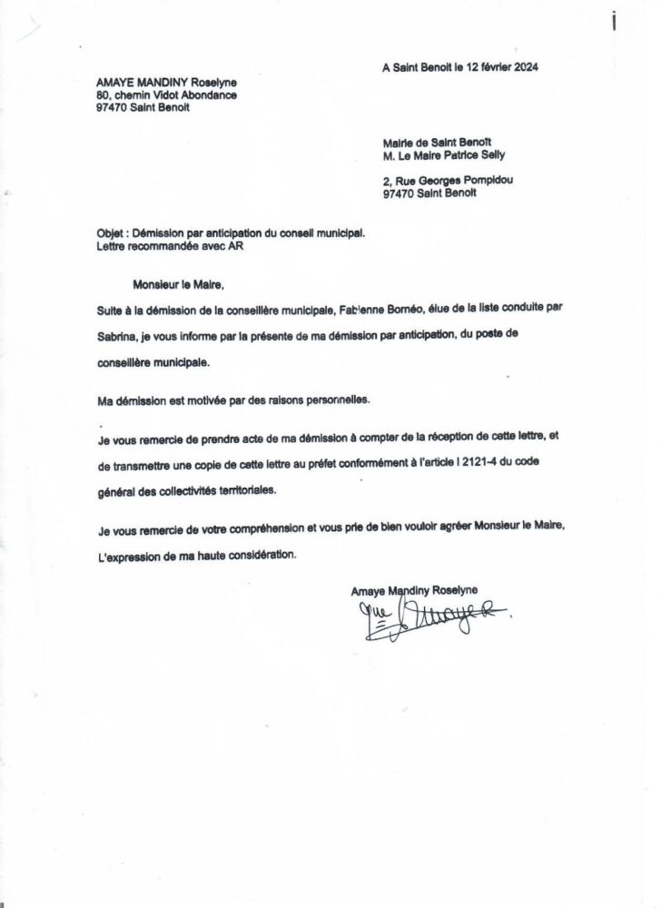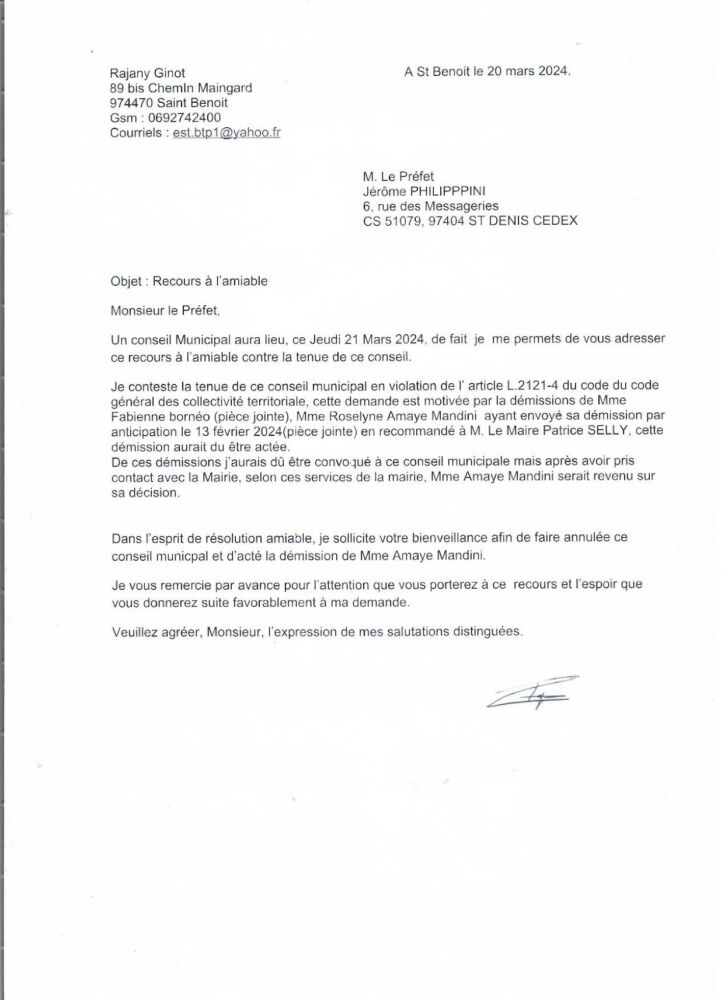 Je conteste la tenue de ce conseil municipal en violation de l’ article L.2121-4 du code du code général des collectivité territoriale, cette demande est motivée par la démissions de Mme Fabienne bornéo (pièce jointe), Mme Roselyne Amaye Mandini  ayant envoyé sa démission par anticipation le 13 février 2024(pièce jointe) en recommandé à M. Le Maire Patrice SELLY, cette démission aurait du être actée.