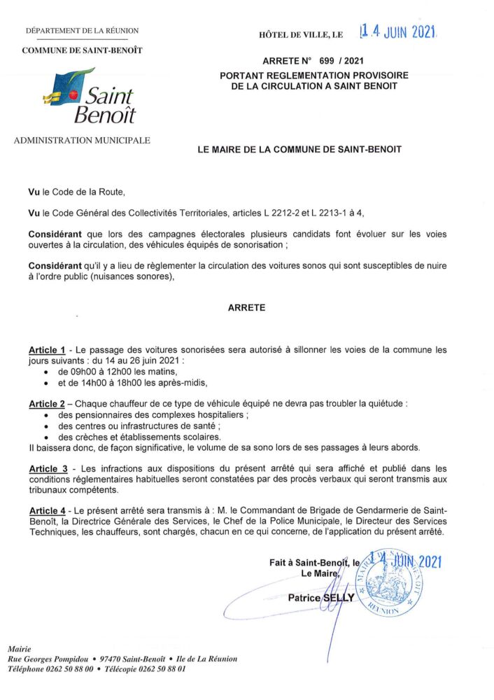 Le maire de Saint-Benoît a publié un arrêté réglementant l’usage des voitures sonos sur la commune, durant la période des élections.