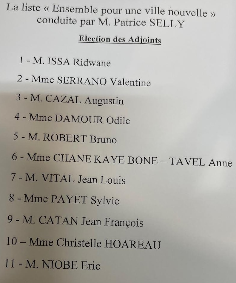 Voici ci-dessous le nouveau tableau des 11 adjoints de la liste « Ensemble pour une ville nouvelle », qui avait été conduite en 2020 par Patrice Selly.