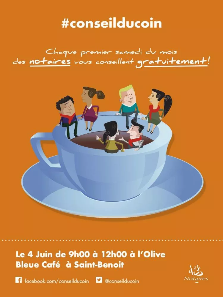 Les Notaires de l’Est vous donnent rendez-vous pour un nouveau « Conseil du Coin » le 4 juin de 9h à 12h00 à l’Olive Bleue Café, 12 bis, rue Georges Pompidou – 97470 Saint-Benoît.